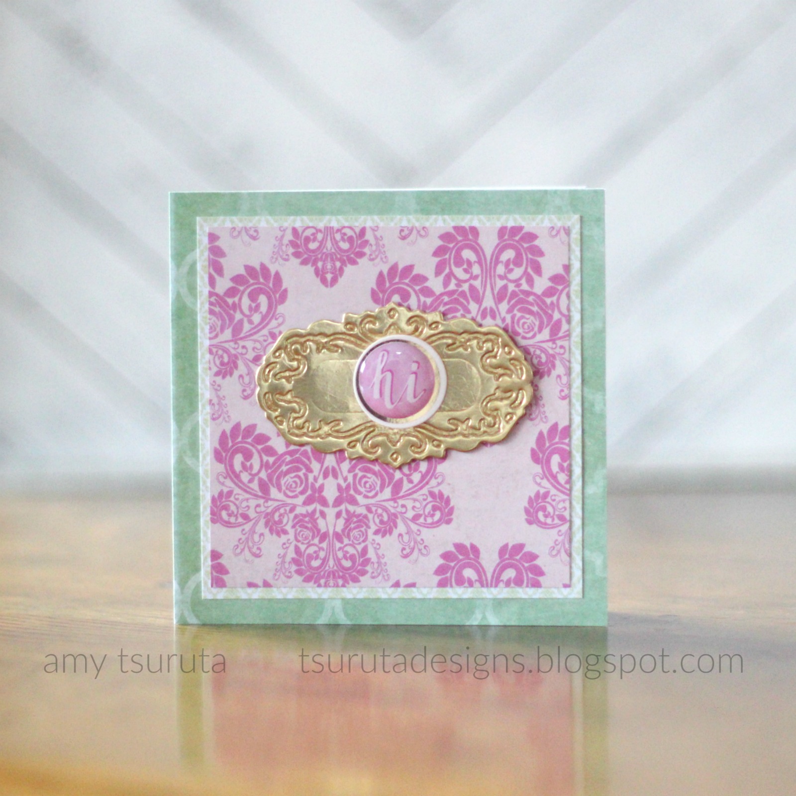 My final card is 4.25x 4.25. Still using the same papers and layering order. I cut the beautiful oval shape in the gold cardstock and finished it off with a Hi sticker.