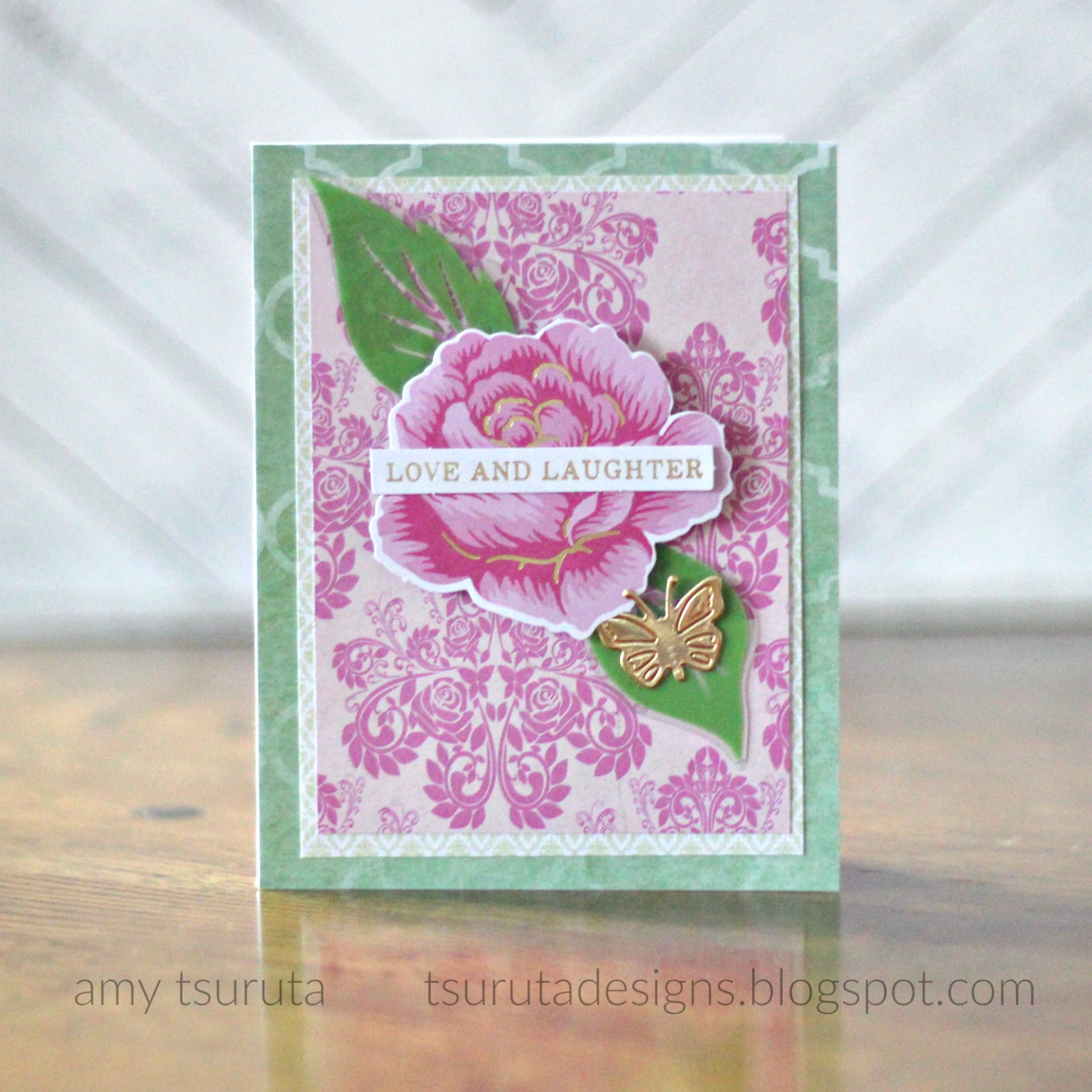 My second card is a standard A2 size. I used the die cut bloom, do you notice the gold details and the sentiment strip. The leaves are printed on acetate but they still have such a bold green color, don’t they? I die cut a butterfly from the gold cardstock, included in the kit.
