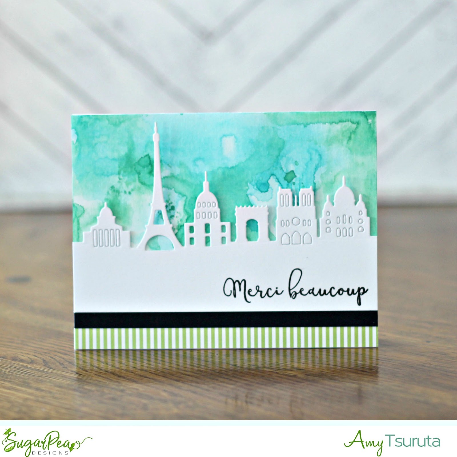 I decided to check the ParisScape white and highlight it with a smooshed Oxide Distress Ink background. The washi looking strip is actually from the Spots & Stripes Brights Patterned Paper.