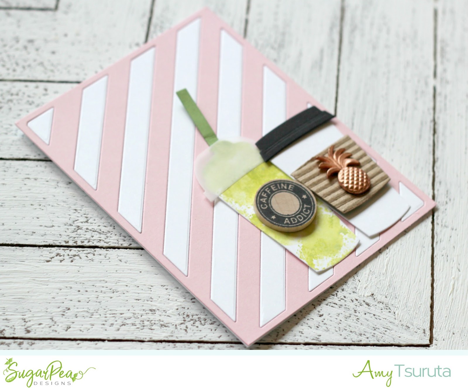 Beautiful card! Using pink and white striping for the background just makes it pop! I really like all the dimensions going on too! And the pineapple on the coffee cup is so adorable!