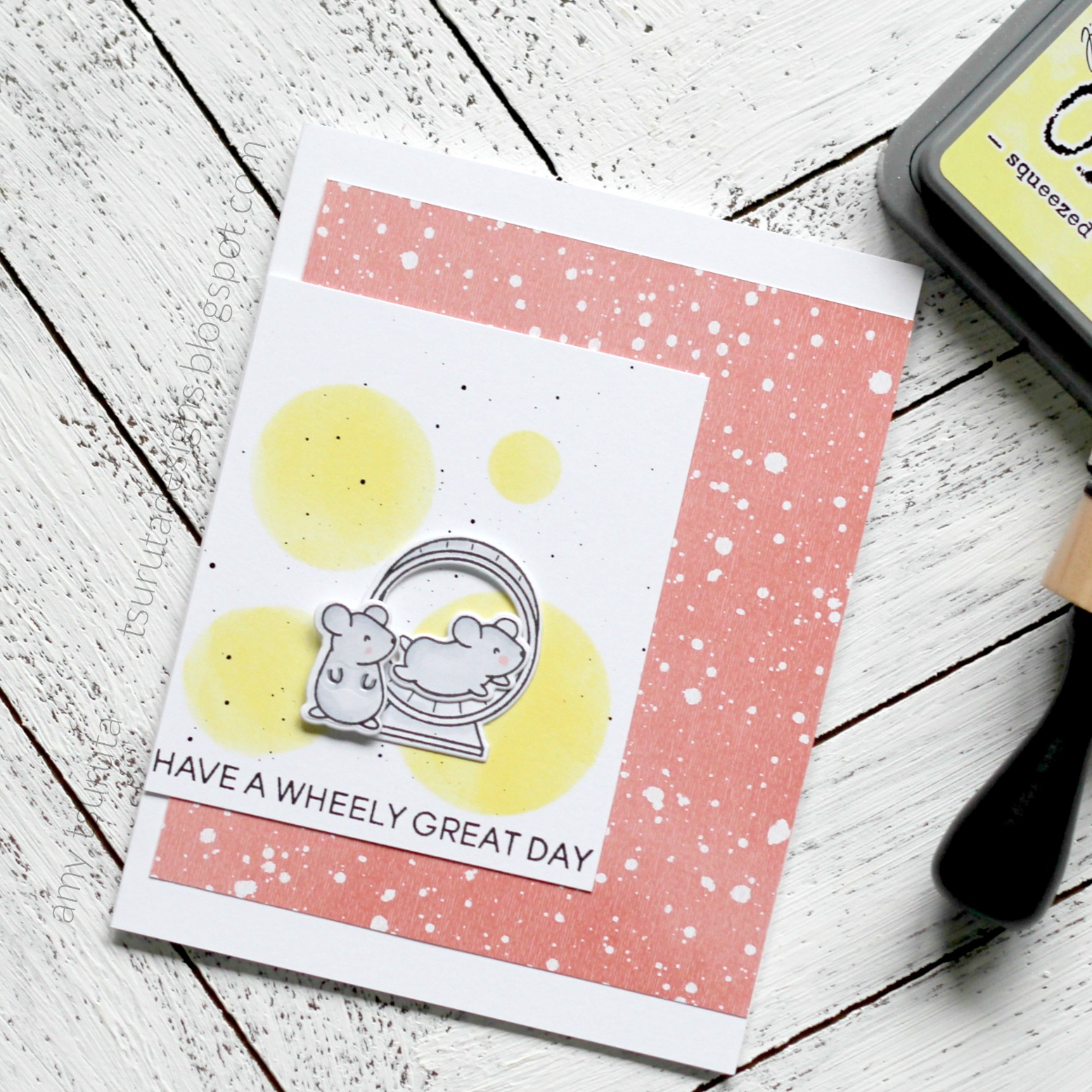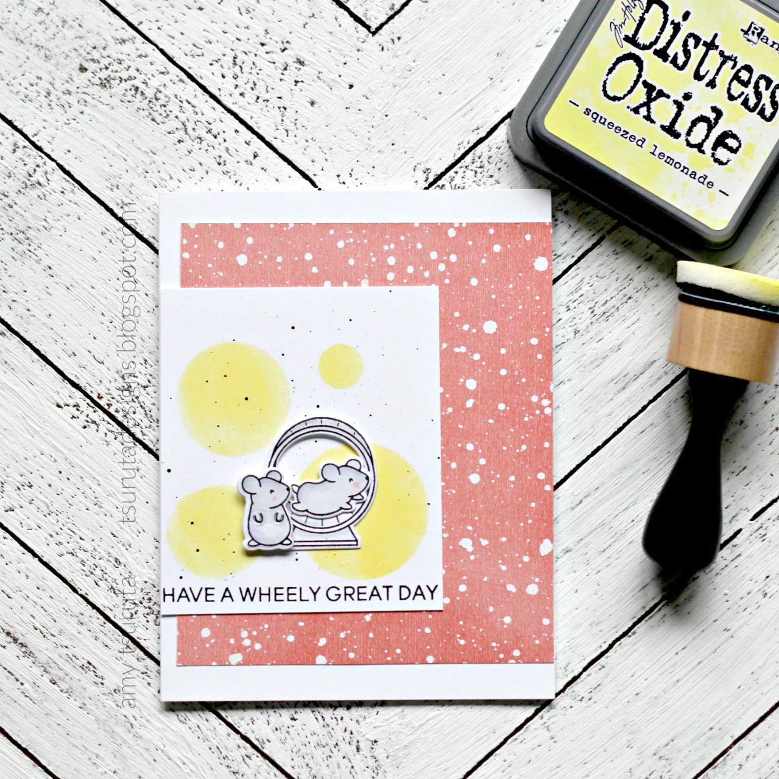 Honestly, I wanted to use all of the cute images in the set but decided on the three and then made my own ‘cheesy stencil’ with Hero Arts Infinity Circle Dies. I topped everything off with paint specks with my Kuretake Gansai Tambi black watercolor.