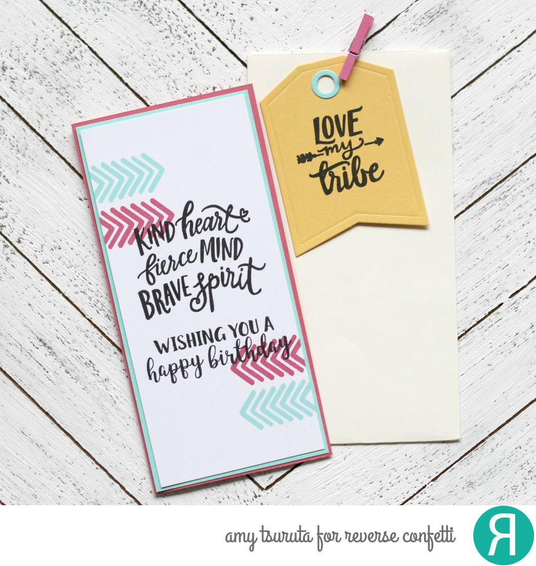 My card is a tall + skinny design. I’ve layered Flamingo, Iced Aqua and Premier Polar White panels. I’ve stamped the arrows from My Tribe in the coordinating ink colors and finished off the card with a sentiment from My Tribe and Birthday Wishes.