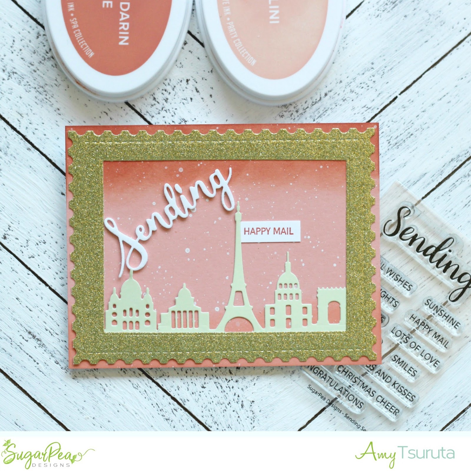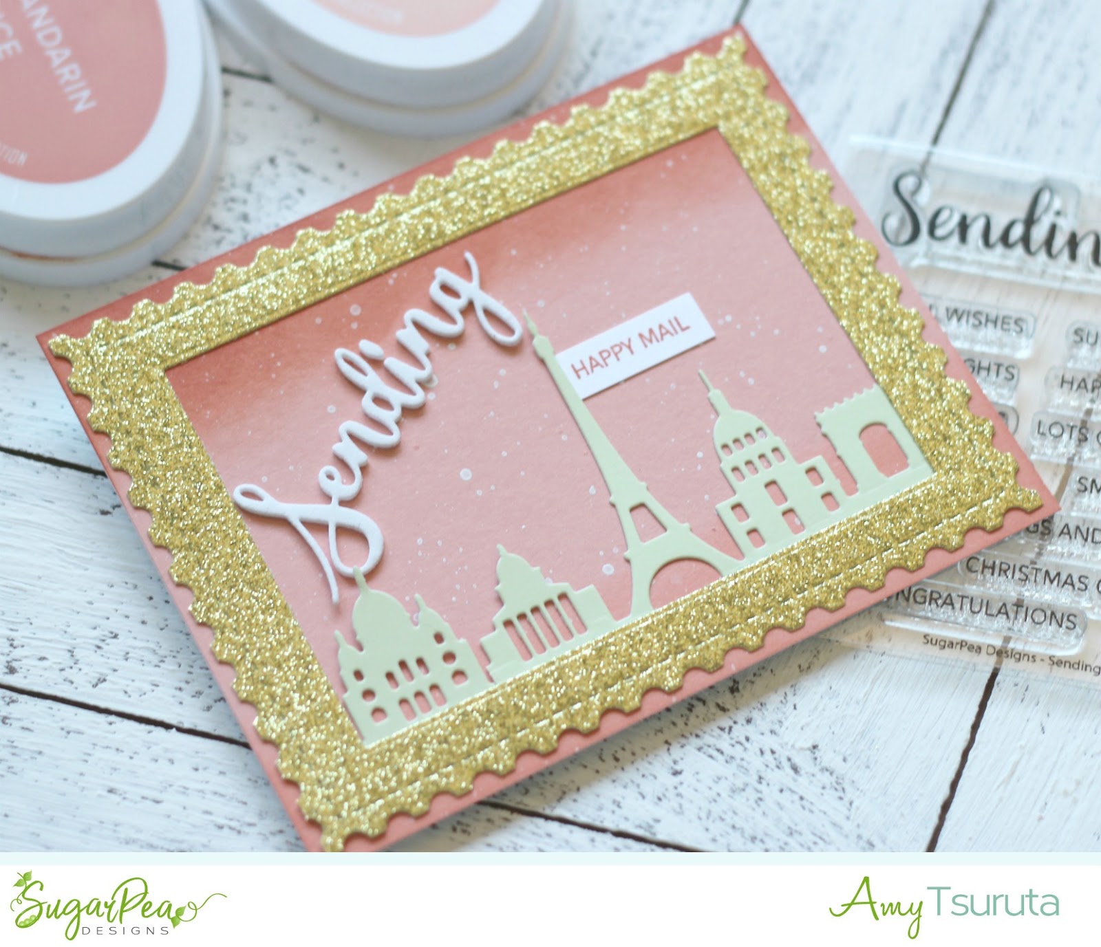 The SugarCut – Postage Stamp is awesome because it comes with words + more. I used the ‘Sending’ in white craft foam. I struggled to figure out where I wanted to put the sentiment, Happy Mail from the Sending Sentiments stamp set. Then it hit me to adhere it behind the Eiffel Tower. It’s been stamped in the coordinating ink used on the upper 1/3 of the base panel.