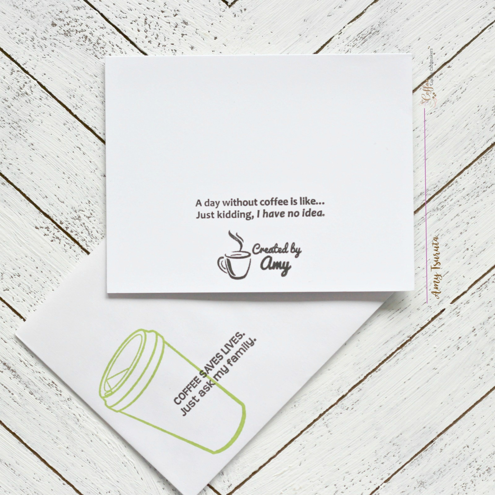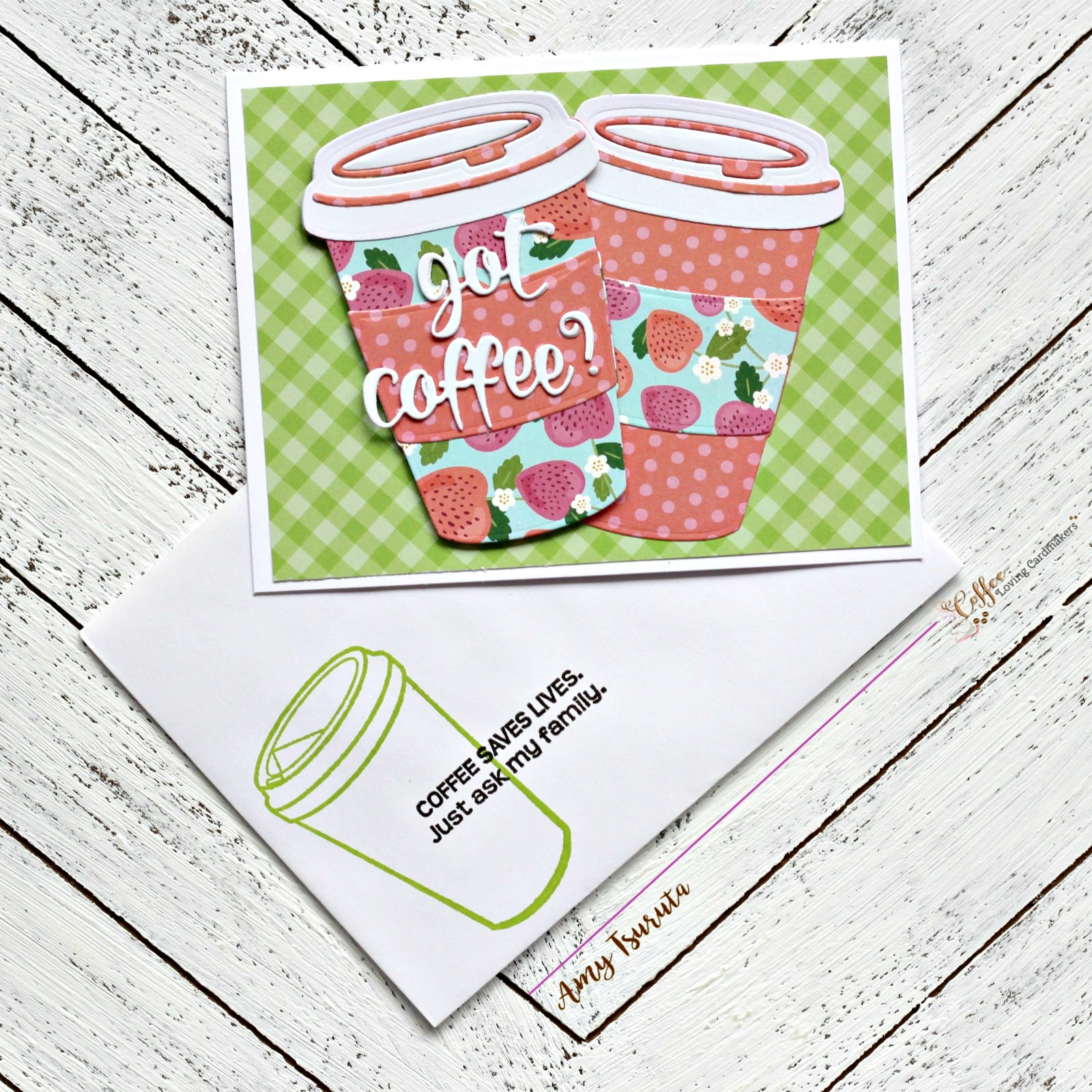 OMGoodness, that coffee cup die is amazing! Gorgeous card! Cute stamped envelope, and I love, love, love your stamp on the back of the card hahaha!