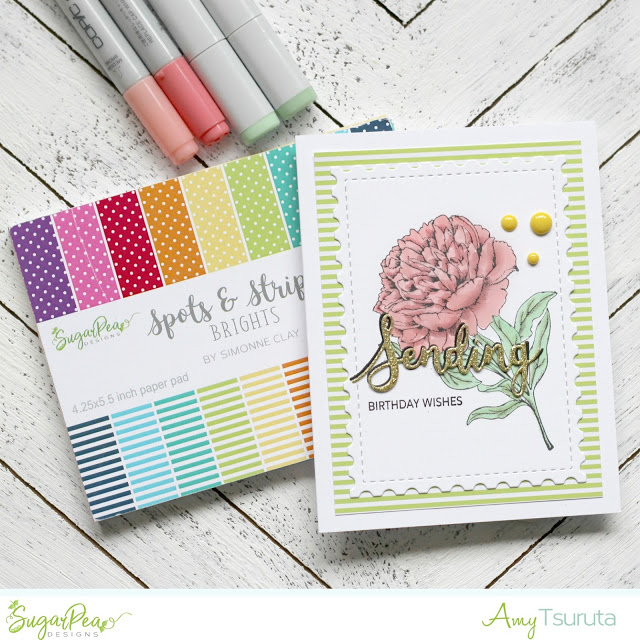 Everything is nestled onto a Postage Stamp panel. I thought rather than just using one color for the background panel, I used two from the Spots & Stripes Brights Patterned Paper Collection.