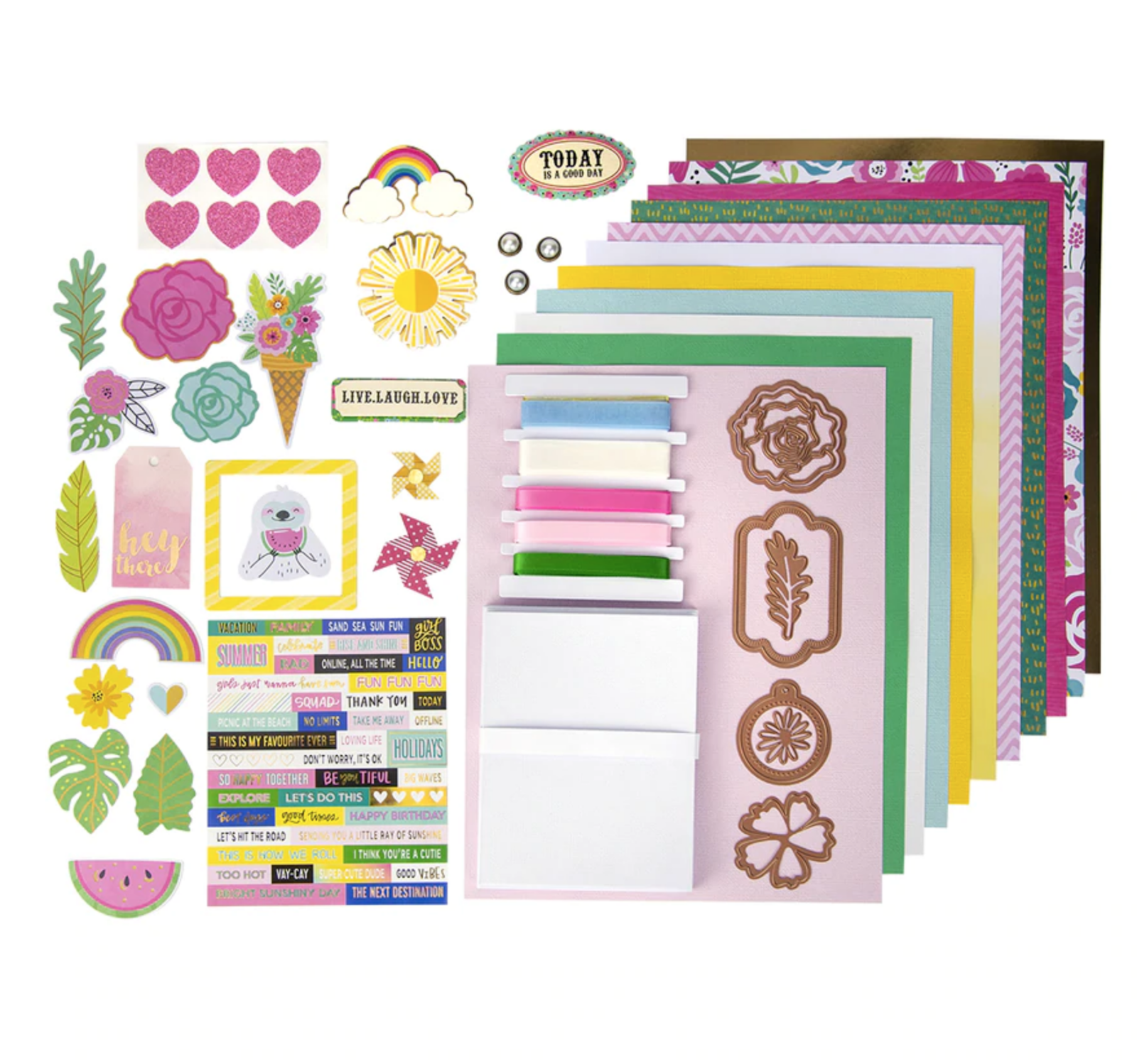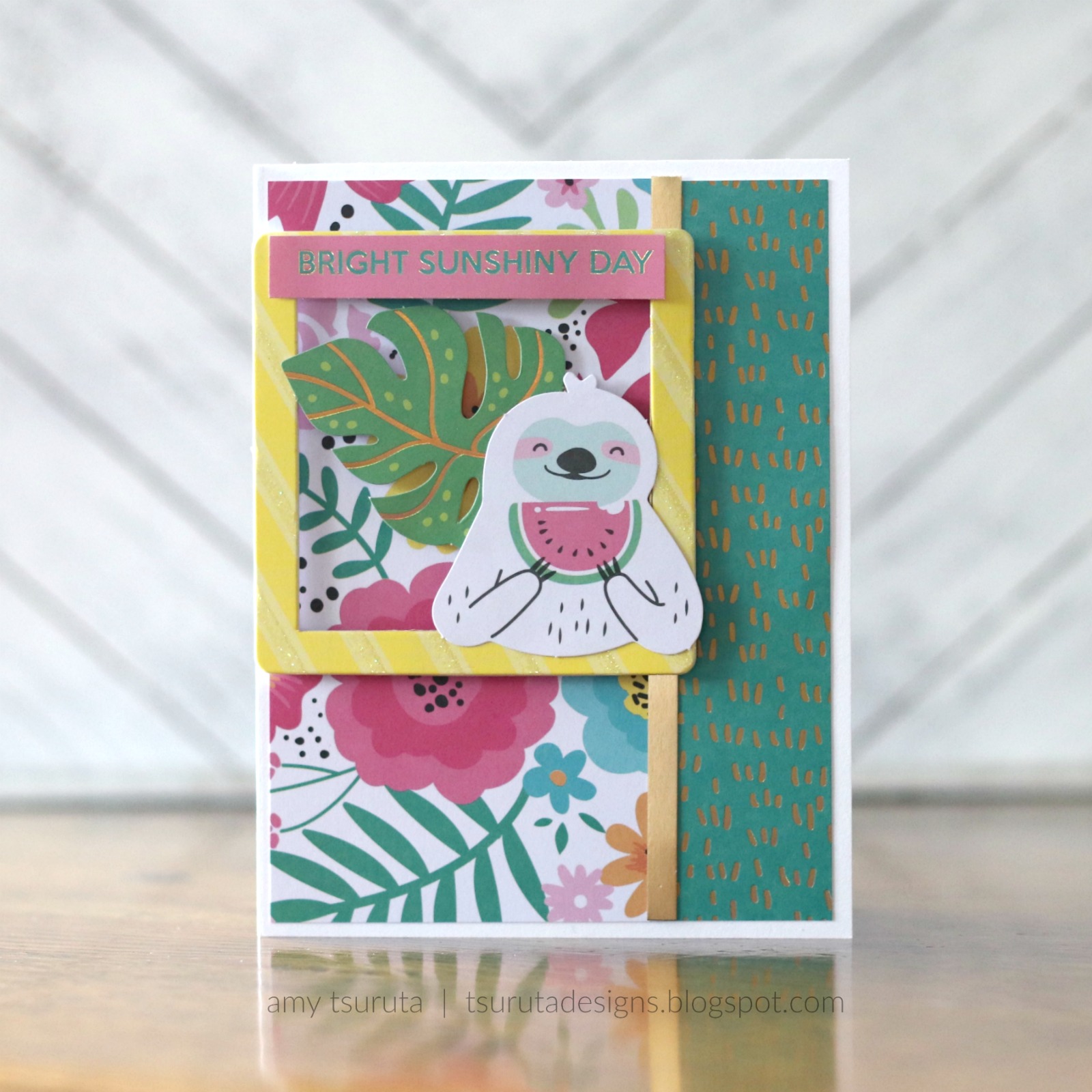 Okay, that watermelon eating sloth?! Love her! This design uses the paper and die cuts from the kit. I didn’t use anything else! The kit comes with adhesive and card bases!
