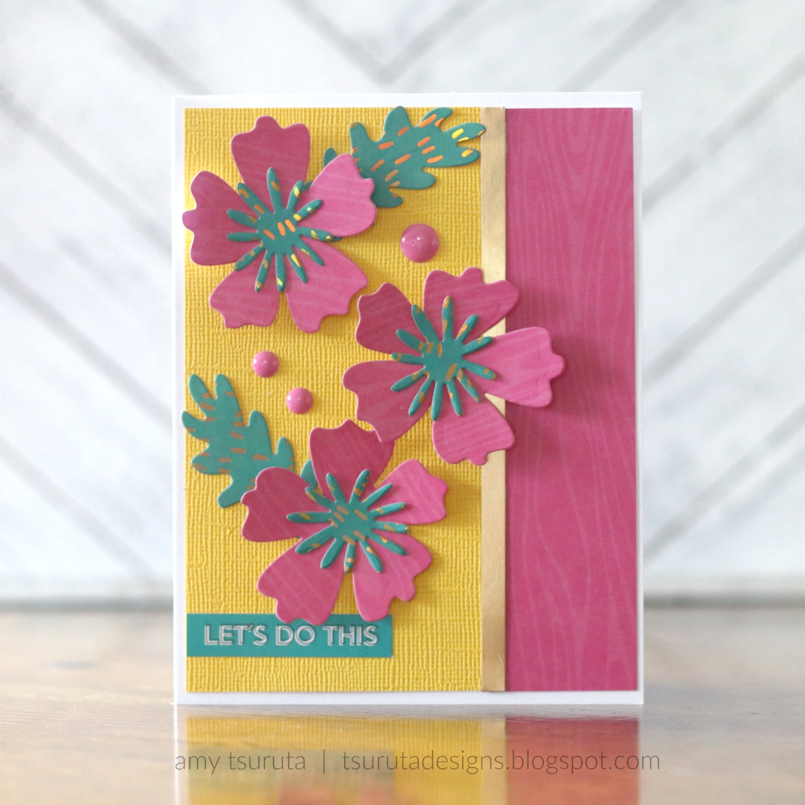 I used the same card design as my first card but decided to not use the floral panel on this one. Love the contrast in textures between the yellow panel and the pink woodgrain. The sentiment is from a sticker sheet that was included in the kit. I did use enamel dots from my stash, they matched perfectly.