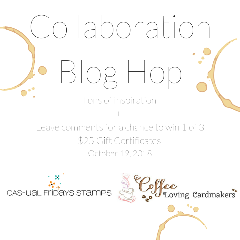 Remember to leave comments along the way to win one of three $25 Gift Certificates to CAS-ual Friday Stamps! Commenting to close on Friday, October 26, 2018 at 11:55 pm pacific. Winners to be posted on the CAS-ual Fridays Stamps + Coffee Loving Cardmakers blog on Saturday, October 27th.