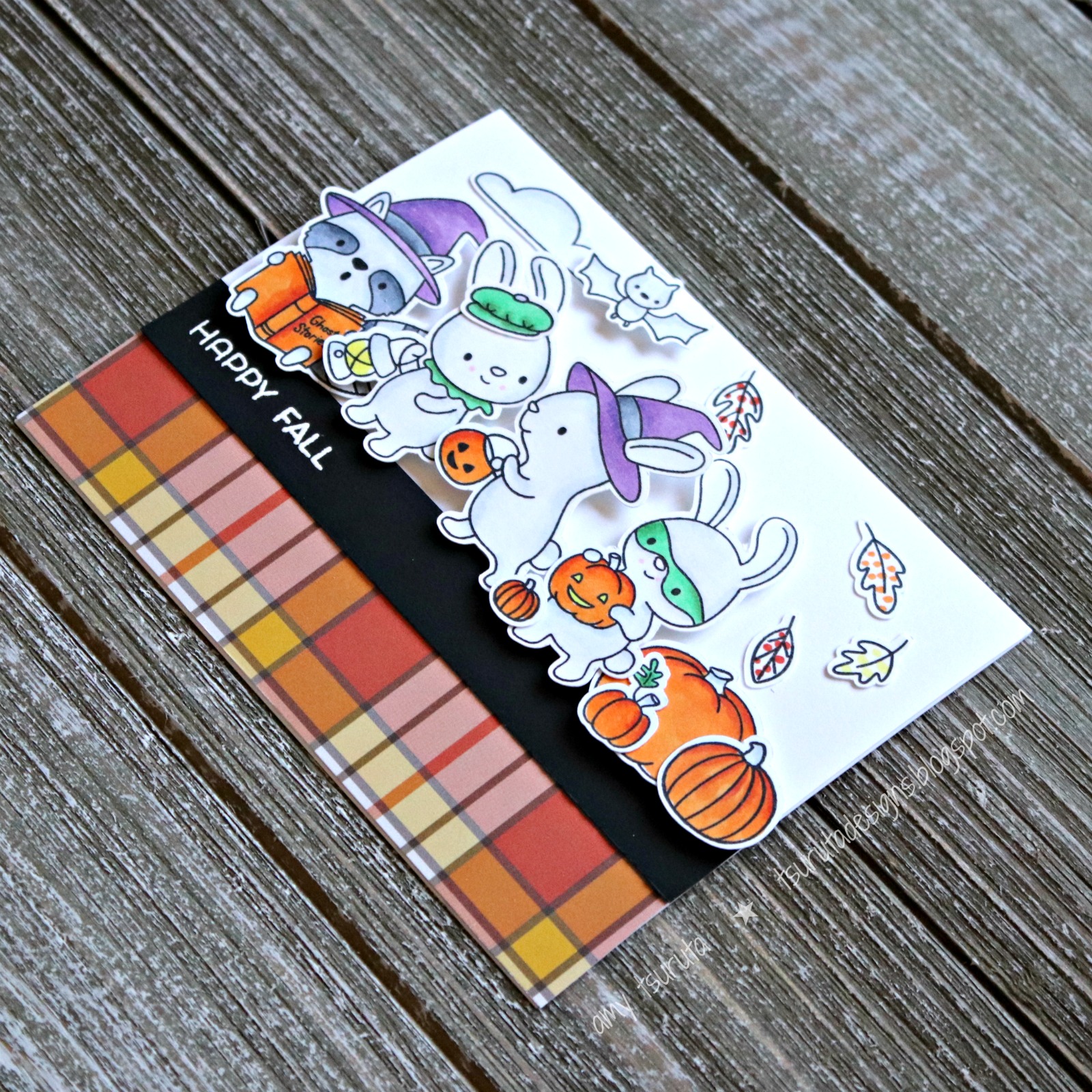This is soooooo stinkin' cute, Amy! Everything is perfect…. love those critters, love the plaid, love the embossed sentiment strip and the whole line up. I just noticed the little polka dots on the leaves, too. How fun is that?!! Total cuteness!