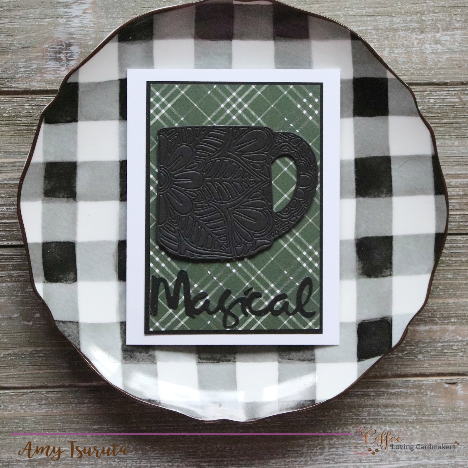 two fantastic cards — can't decide which one i like more — the all black cup looks great with the dark green, while the gray, green, and white combo cup pops off very nicely against the plaid background!