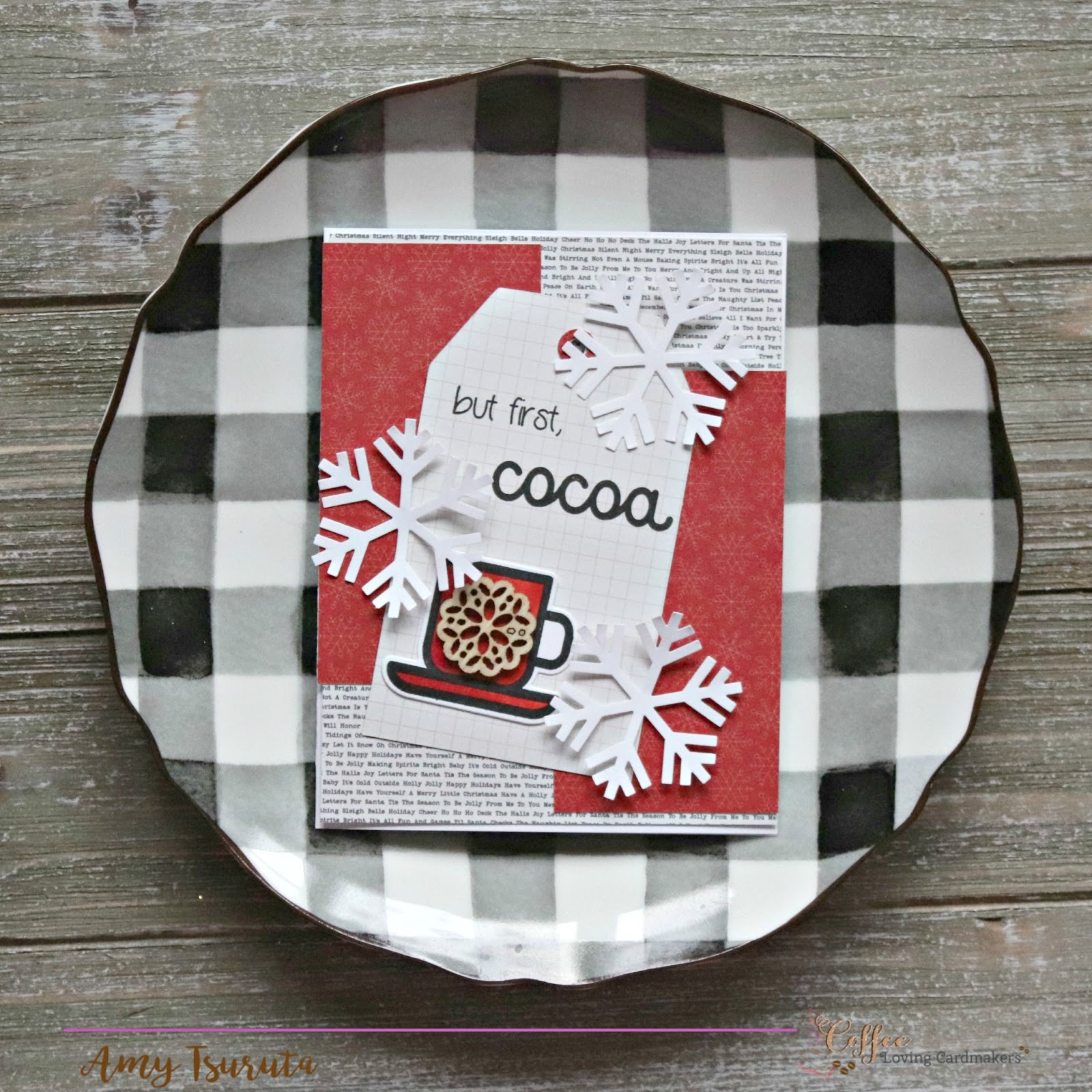 I REALLY, REALLY like this card Amy! Along w Starbucks hot chocolate. 🙂 liked the added touch of the newsprint as well. Hey, it may SNOW here in northern Atlanta this weekend! Yikes! It'll look beautiful and be best for all the drivers to stay inside!