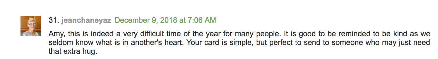 Amy, this is indeed a very difficult time of the year for many people. It is good to be reminded to be kind as we seldom know what is in another's heart. Your card is simple, but perfect to send to someone who may just need that extra hug.
