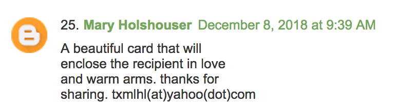Amy, your card is really warm and thoughtful! I am so glad to see that you are a part of this awesome blog hop. It is so important to get the word out, especially during the holiday season when it is so easy to be wrapped up in our own busy schedules. Thank you so much!