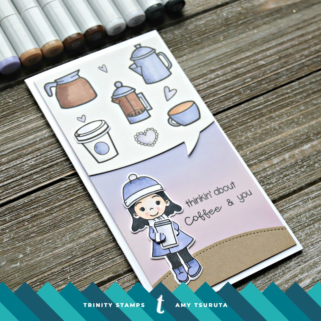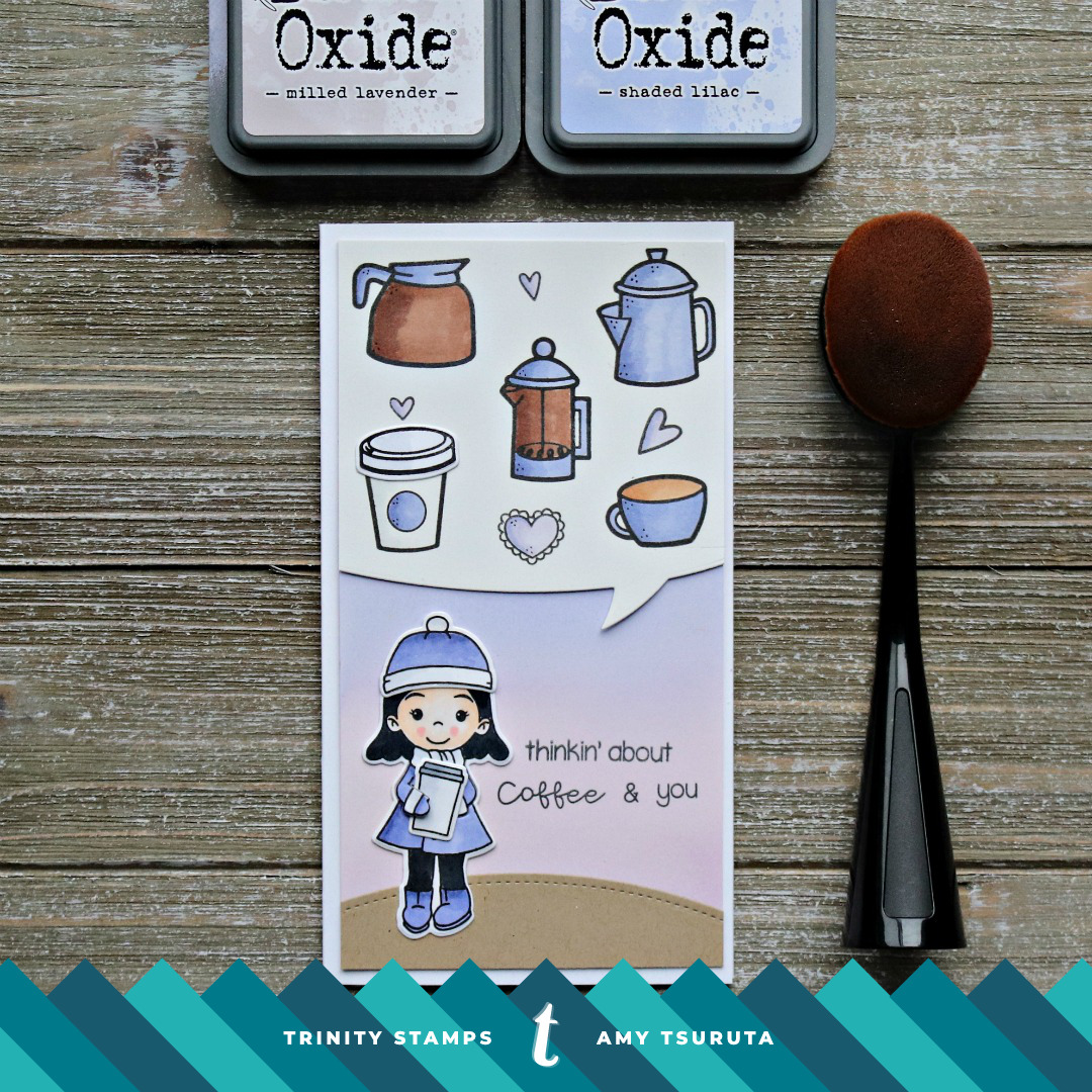 The thought bubble is filled with images from the Coffee with Character along with some hearts from the Seasonal Sweetheart set. The sentiment has been customized by using the Caffeinated Sentiments stamp set. Do you spy that ink background? That has been created using the Trinity Blendabilites Self-Standing Ink Blending Brush Set. It makes blending a snap, seriously.
