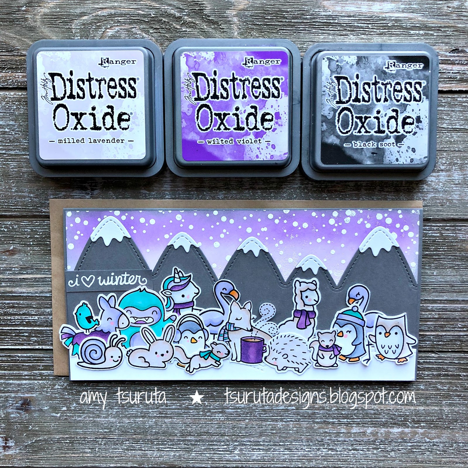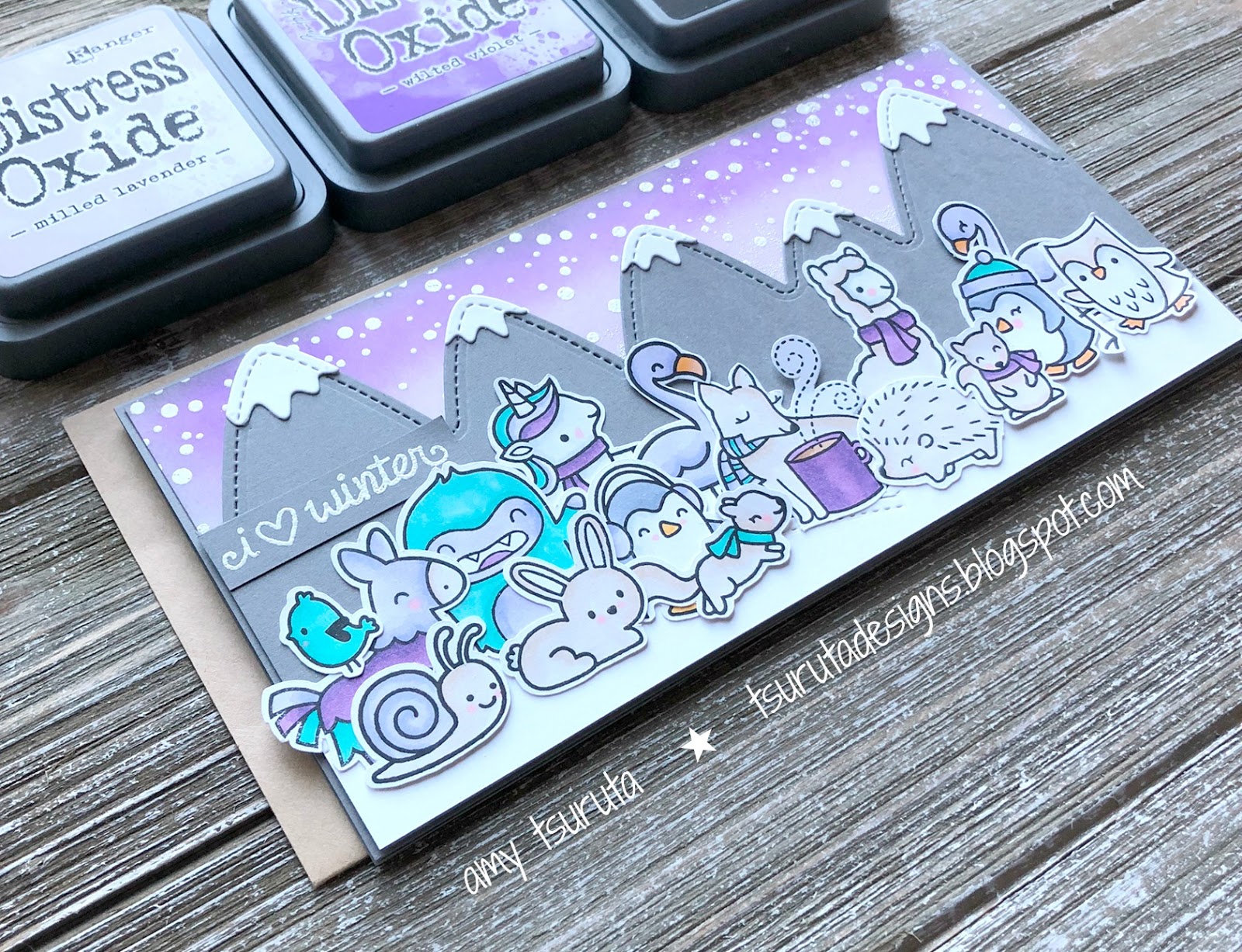 I started with a bristol panel and inked it up with Milled Lavender + Wilted Violet with my Trinity Blendabilities. I inked up the edges with Black Soot. I finished it off with snow by heat embossing the snow stamp in Snow Cool. The panel has been mounted on an Essentials by Ellen Slate panel. I cut the Mountain Borders with the same cardstock.