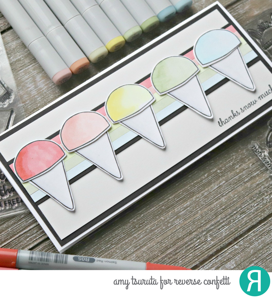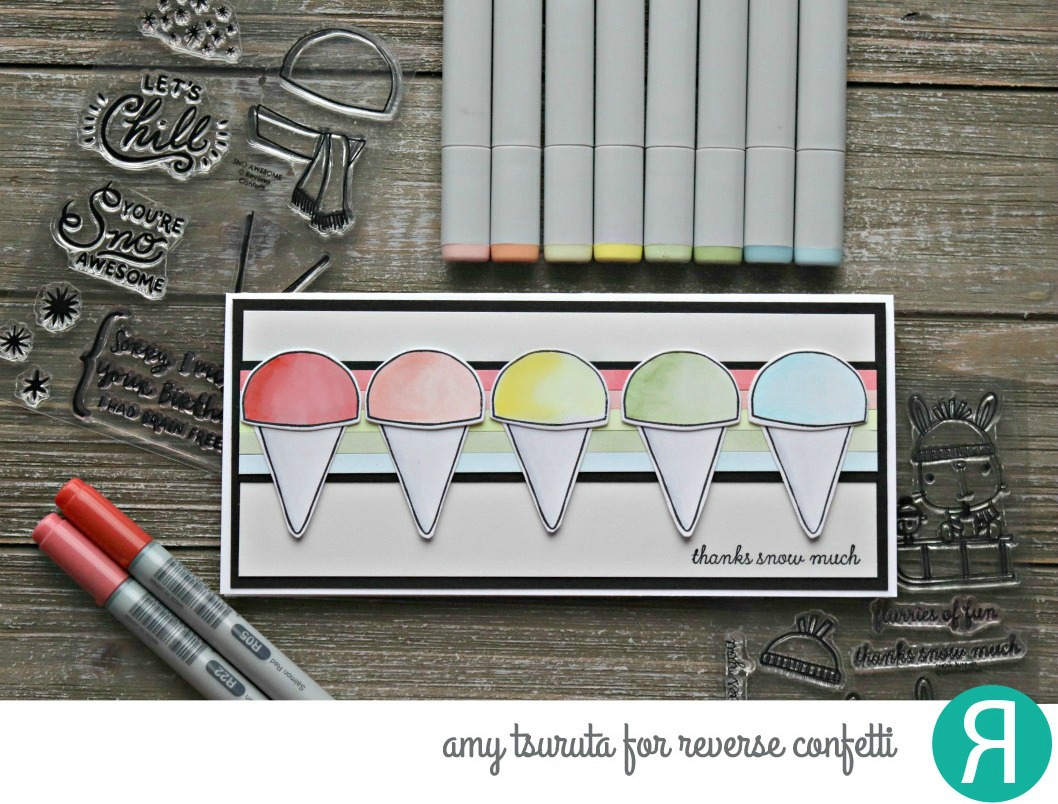 You can’t go wrong with sno-cones and rainbows! I teamed them up with a sentiment from the Snow Bunnies set.