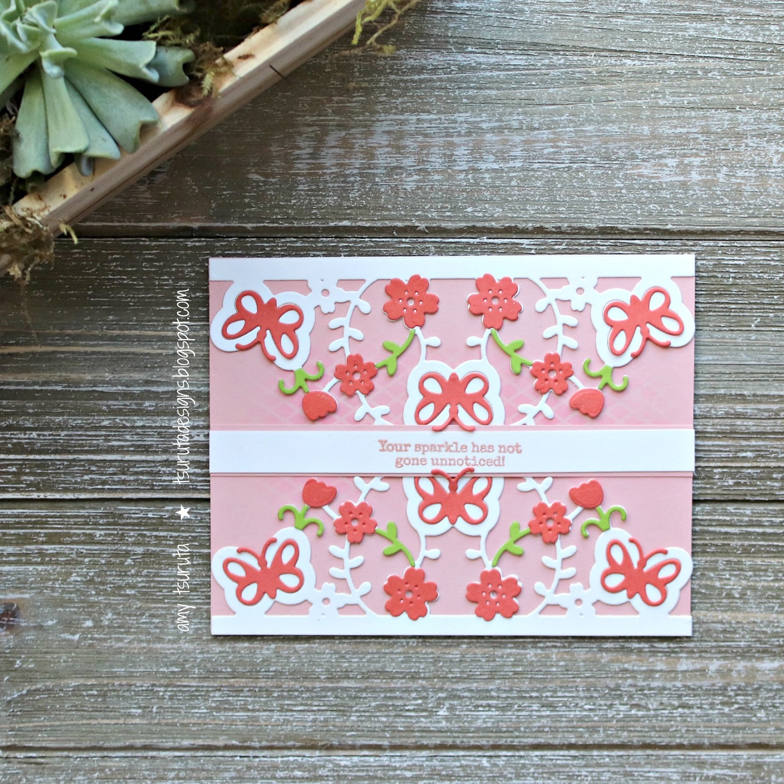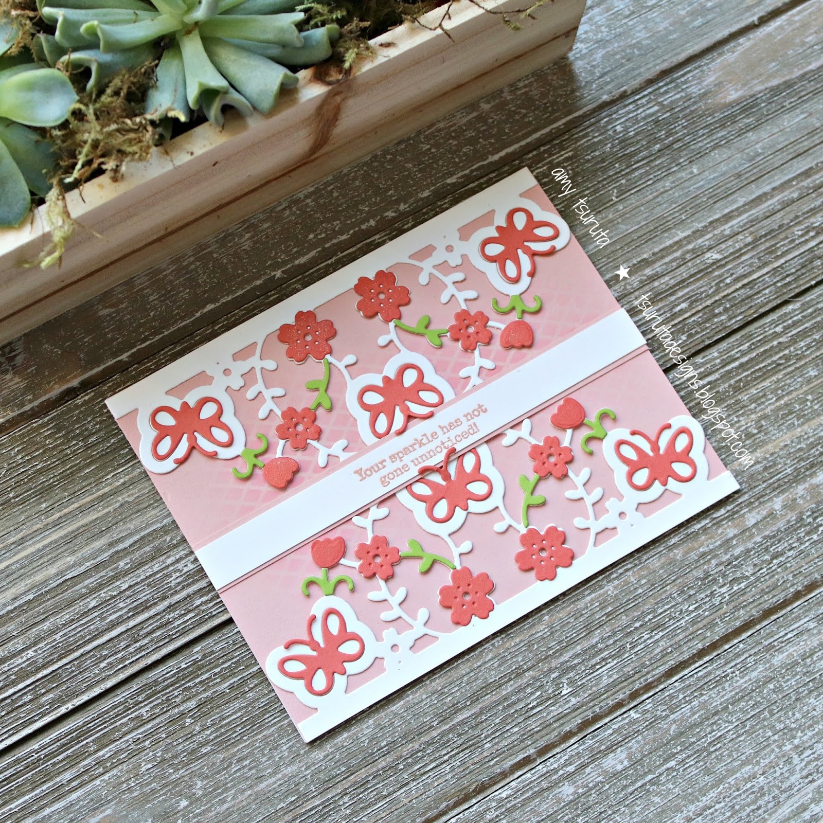 I adore this die! It’s so delicate! I cut it twice and used the smaller separate dies too. I’ve been a bit smitten with the pink and coral color combo lately. The sentiment is from Ellen Hutson LLC and has been heat embossed with Lawn Fawn’s Rose Gold.