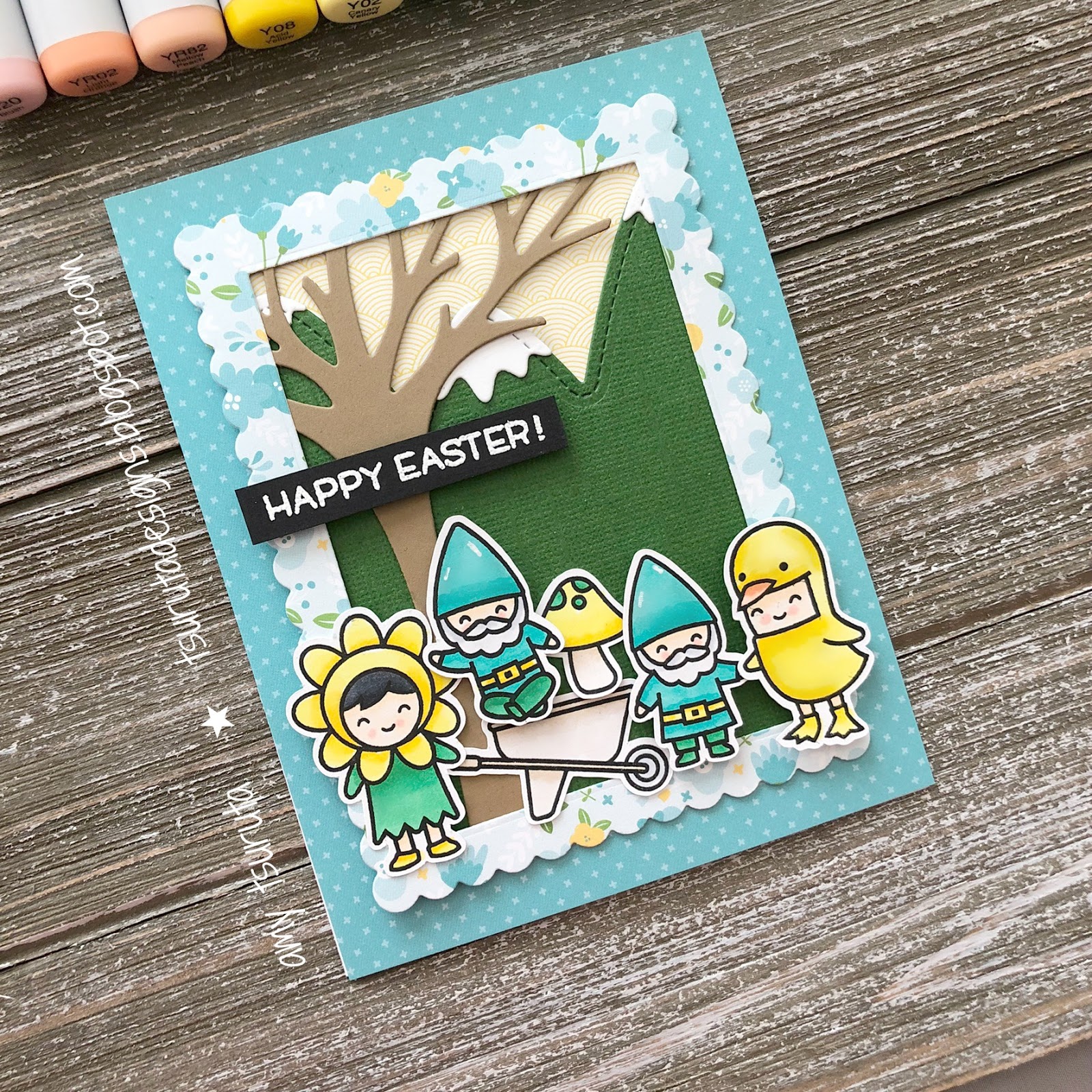 I’m smitten with the Lawn Fawn Oh Gnome! I’ve teamed them up with Easter Party.