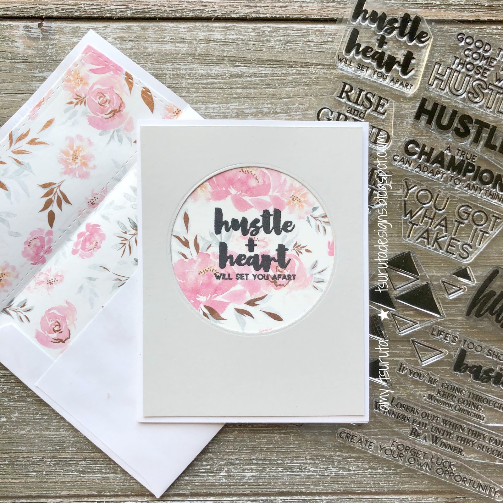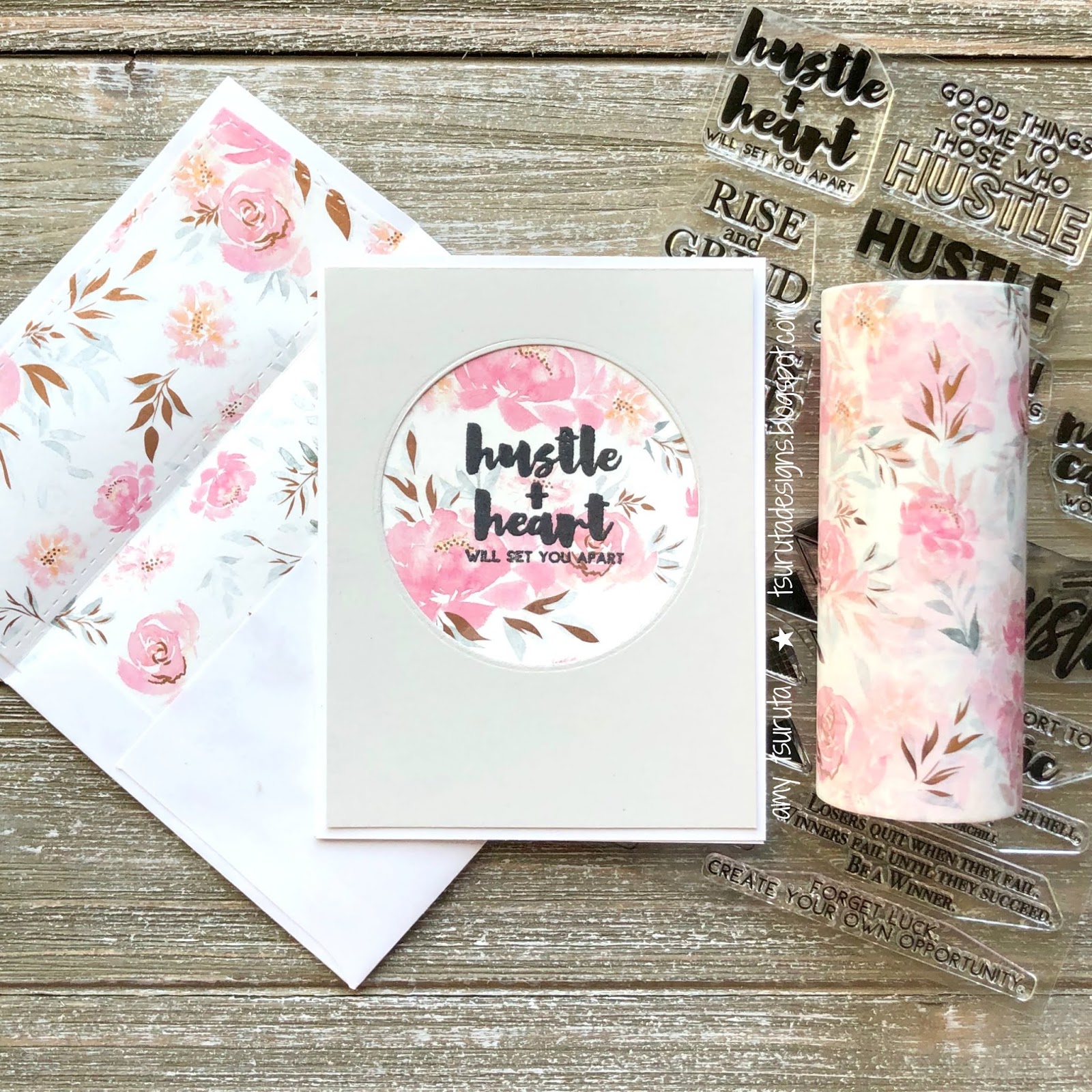 These washi’s are so much fun to play with. I combined the Pink Peonies with the Hustle and Grind Sentiments. The sentiment has been heart embossed in charcoal.