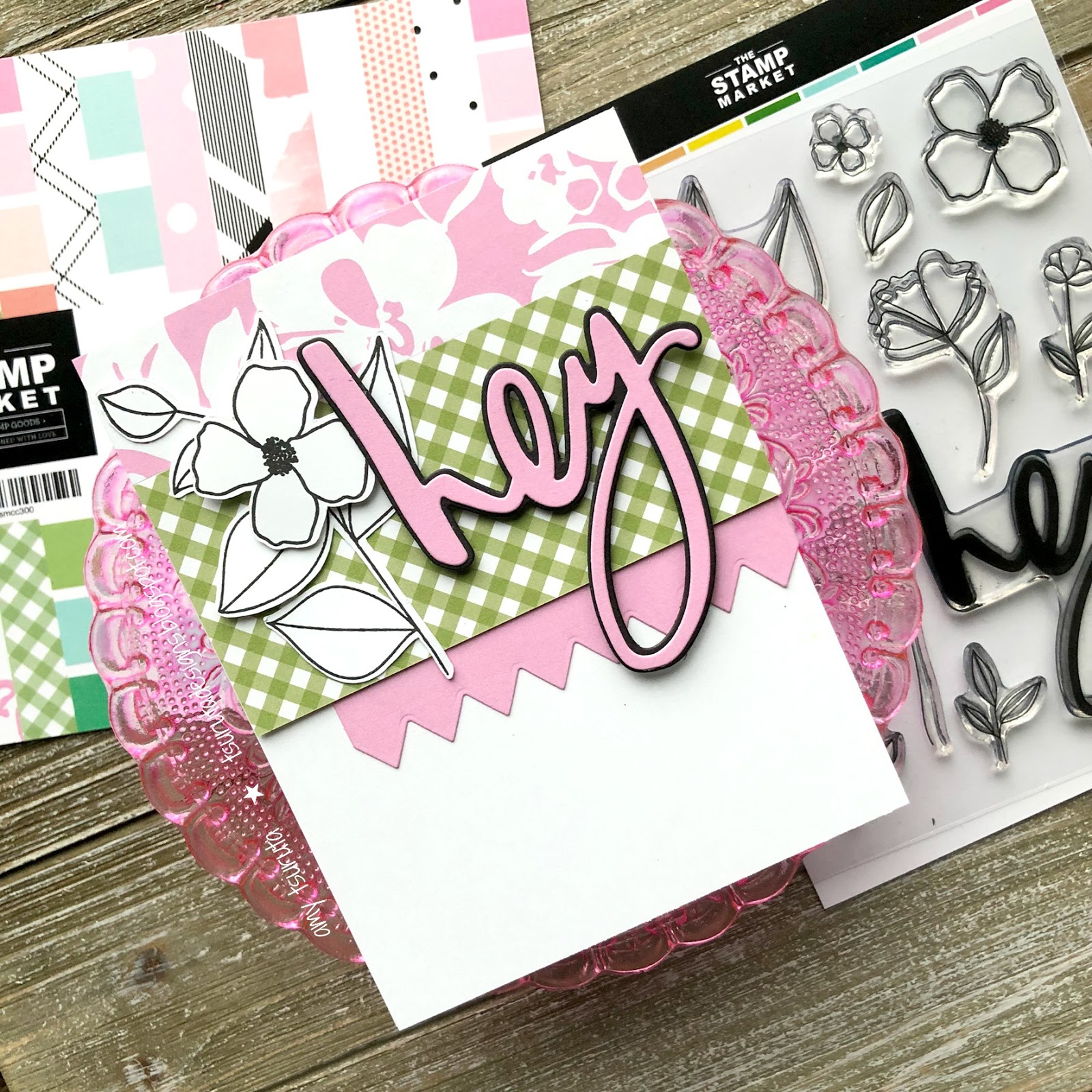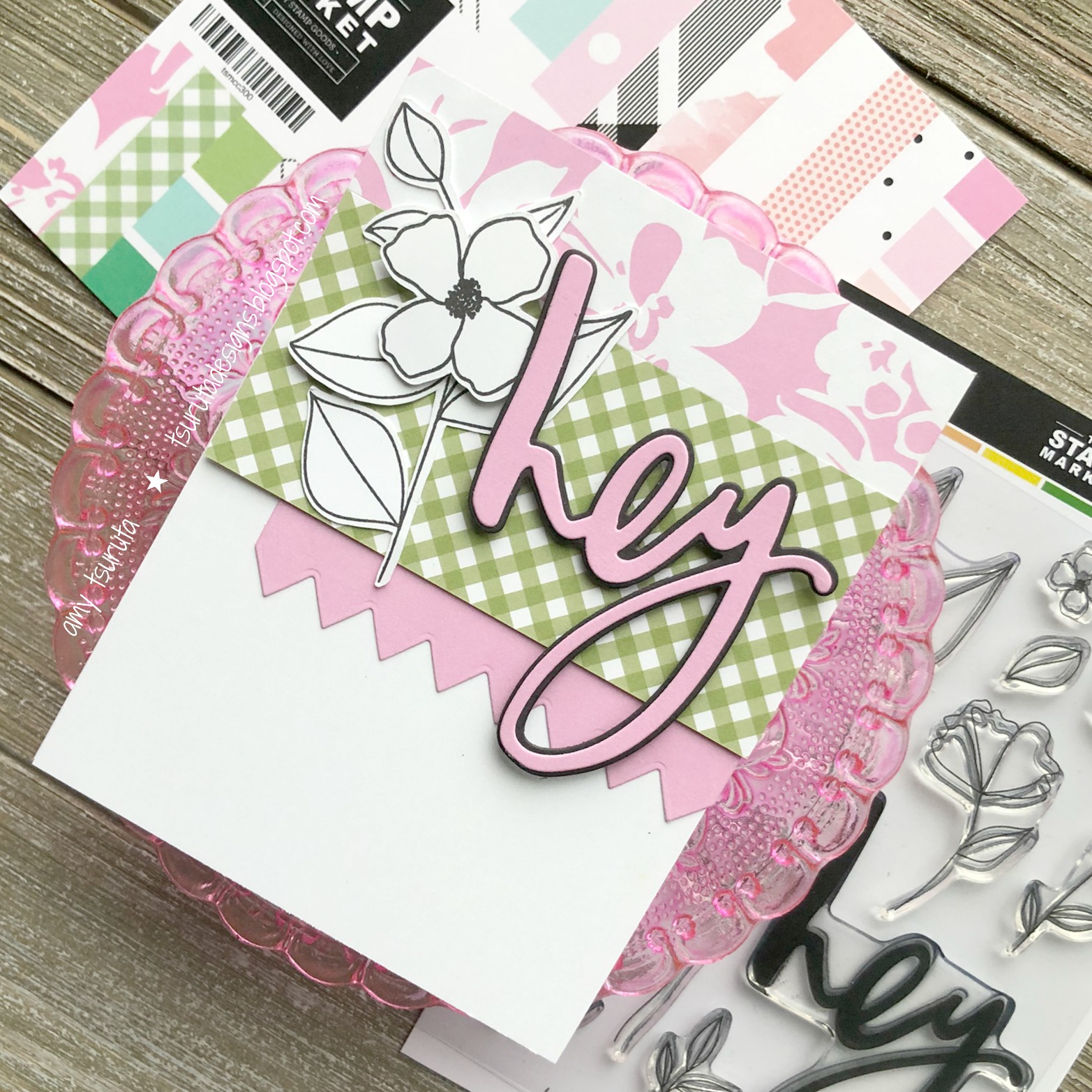 Love the green and pink Amy – that big HEY die cut and fun white layered blooms! xx
