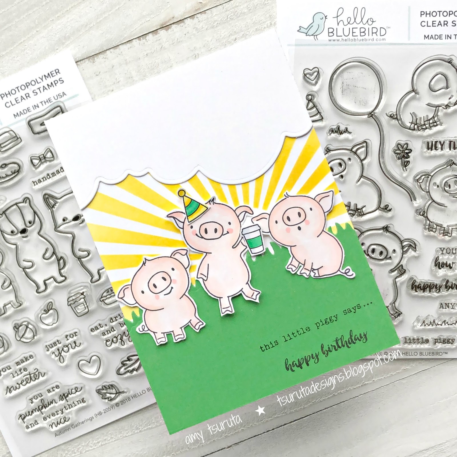 So I should know better than to quickly craft. I whipped up this sweet card using the Hello Bluebird, Autumn Gatherings + Pig Day stamp sets: