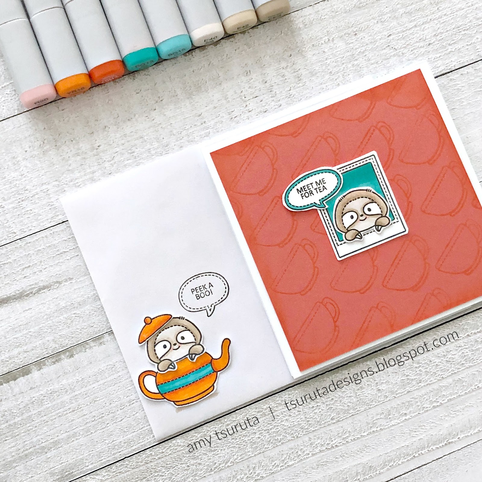 Eep, you’re going to love the Pop Up Collection. I used the little polaroid frame and made it into a window. Love how that ‘lil guy is perched in the window. I stamped the background with the super cute tea cup from the Pop Up Props set.