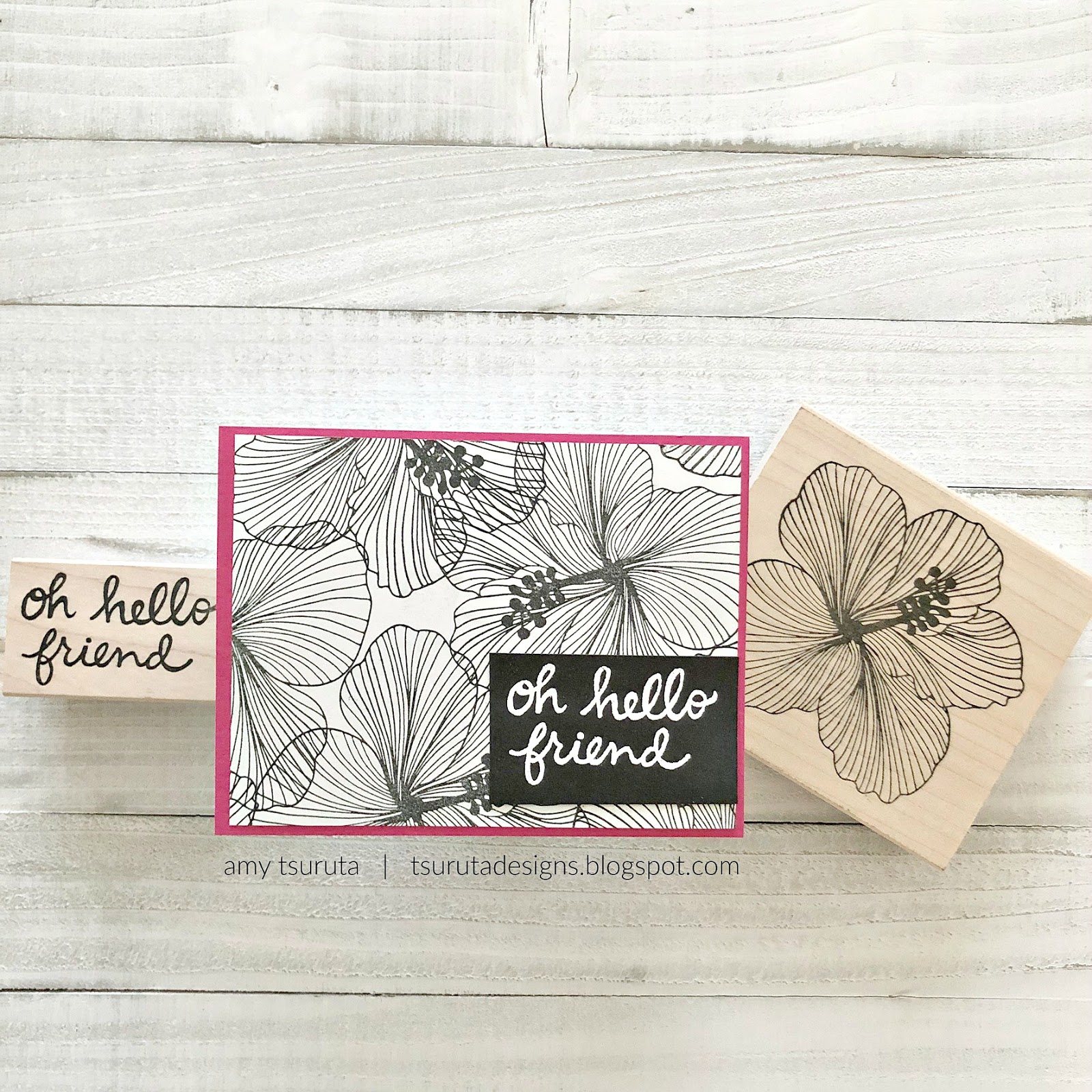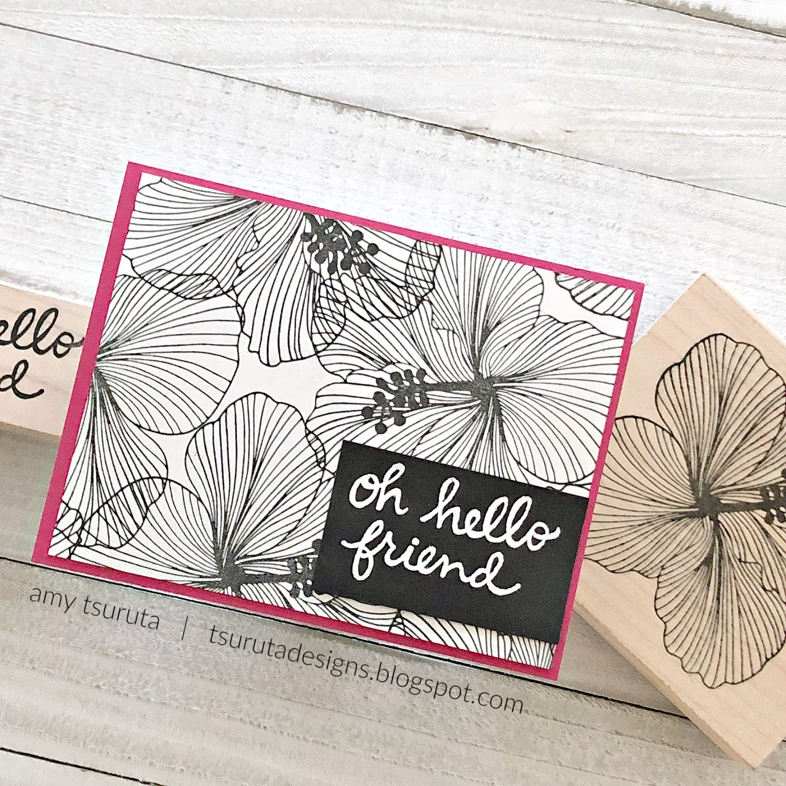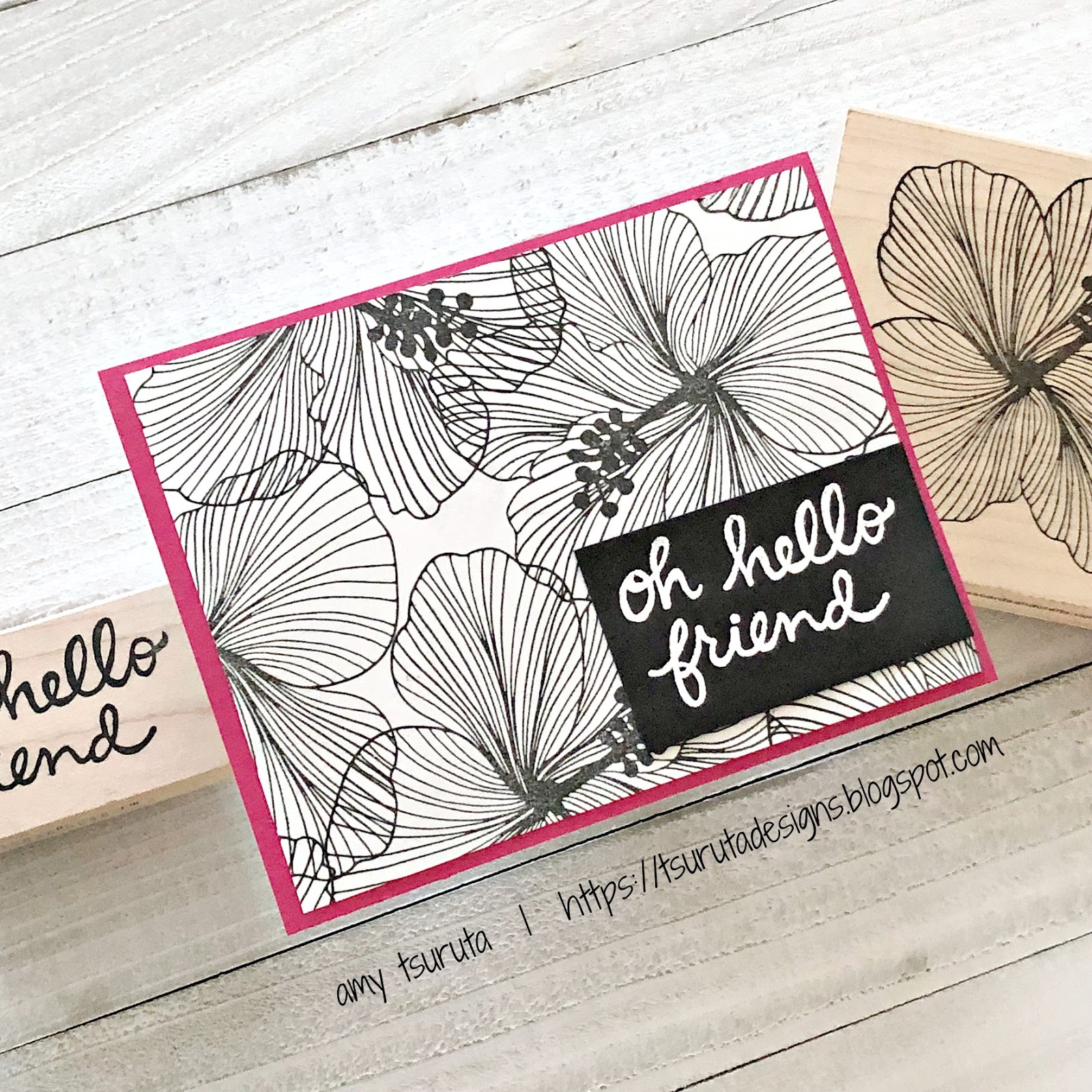 So, I decided to whip up another project that more closely aligned to my style. It still uses the beautiful Impress Large Hibiscus [5636H] + a different sentiment, Savvy Stamps – Oh Hello Friend [1481E].