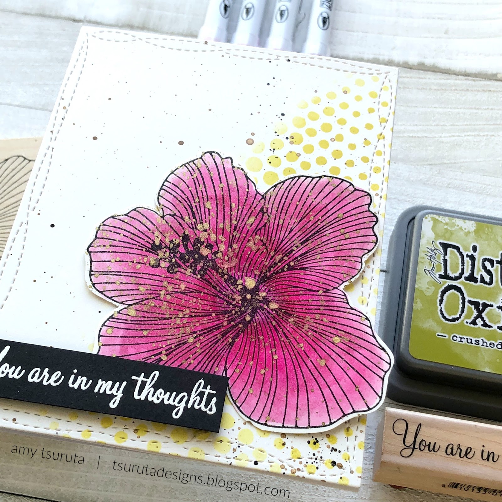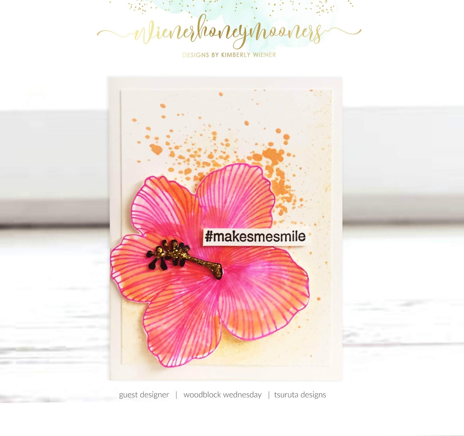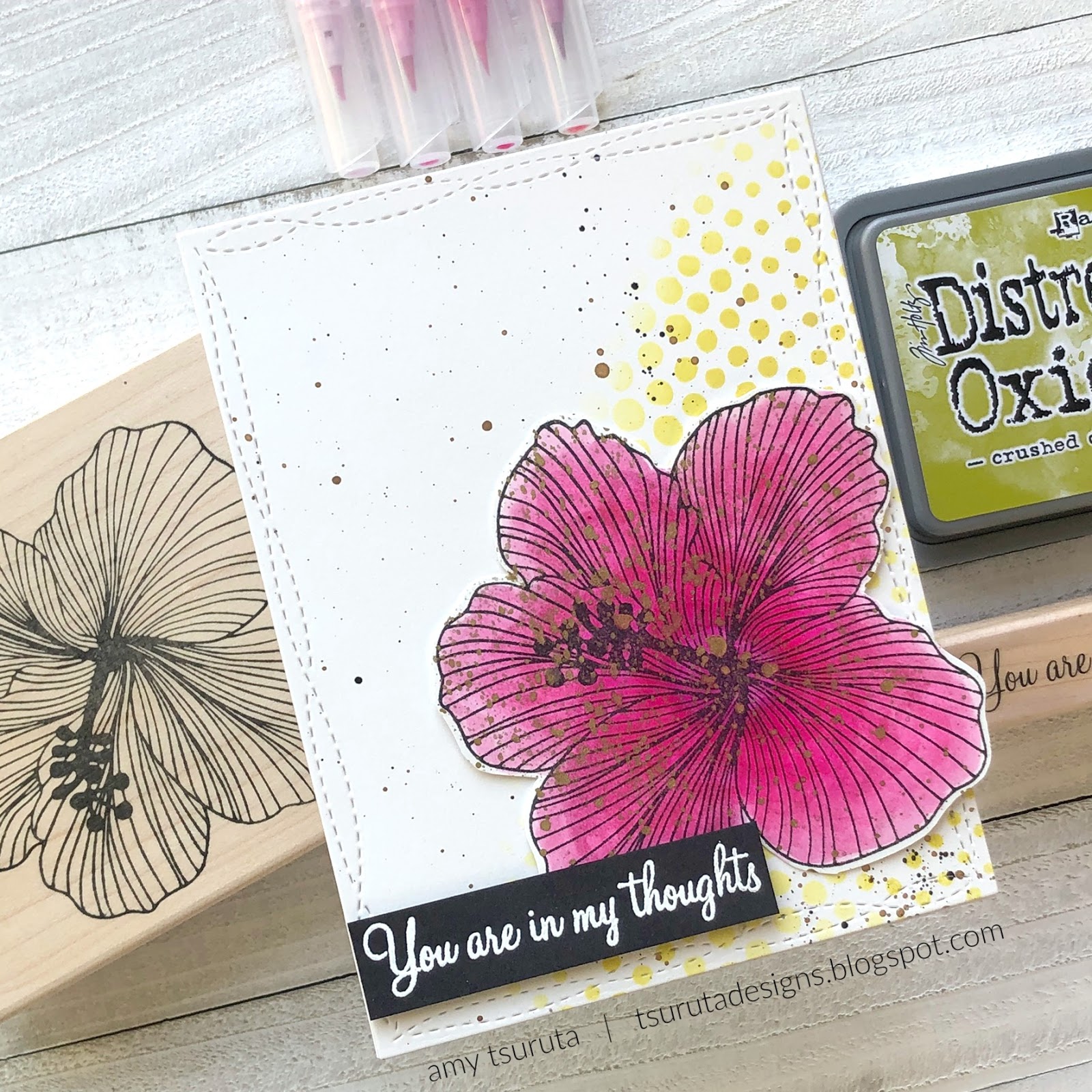 Hello and welcome to the fourth edition of Woodblock Wednesday. Today’s project isn’t in my traditional style, which I think is clean + simple. I’m featuring Impress Large Hibiscus [5636H] + retired A Muse Studio In My Thoughts [9-8633C].