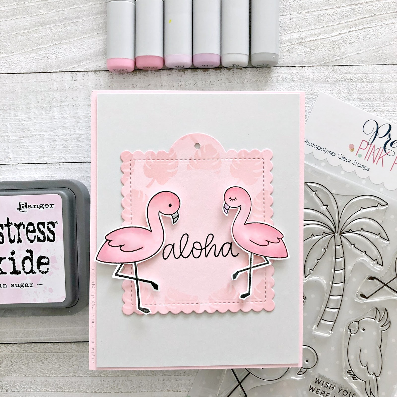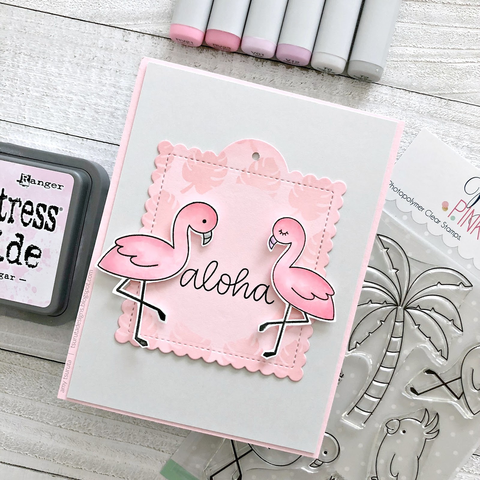 The flamingos have been stamped on Neenah Solar White with Lawn Fawn’s Jet Black and colored with various copics.
