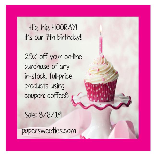 The Coffee Loving Cardmaker’s Design Team is hopping in celebration of Super Sponsor Paper Sweeties 7th Birthday! You should have arrived here from the Coffee Loving Cardmaker’s blog, if not, you’ll want to start there!