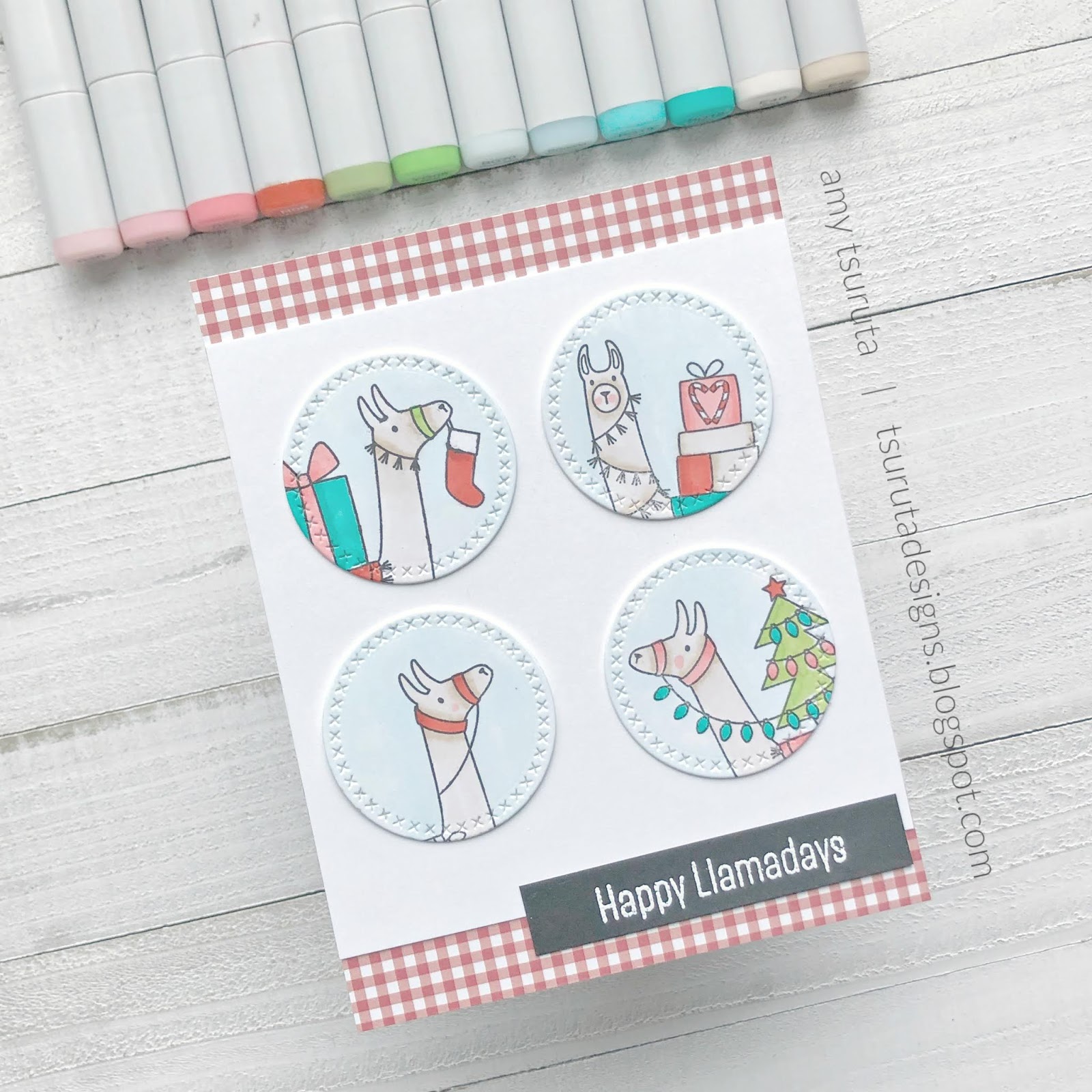 I teamed up the MFT Happy Llamadays with their Tiny Check 6×6. I stamped the llamas out and used the Cross Stitch Stax to cut them.