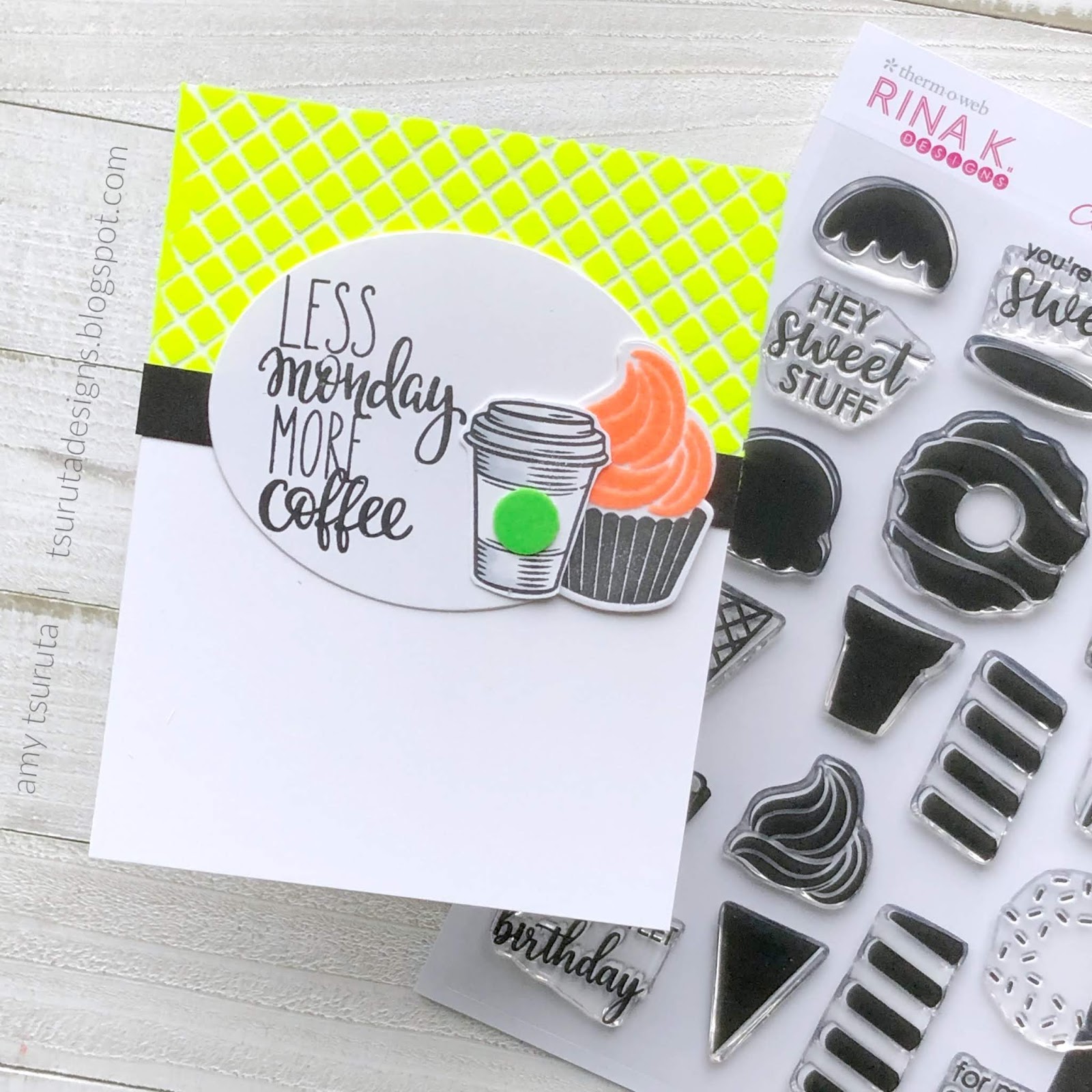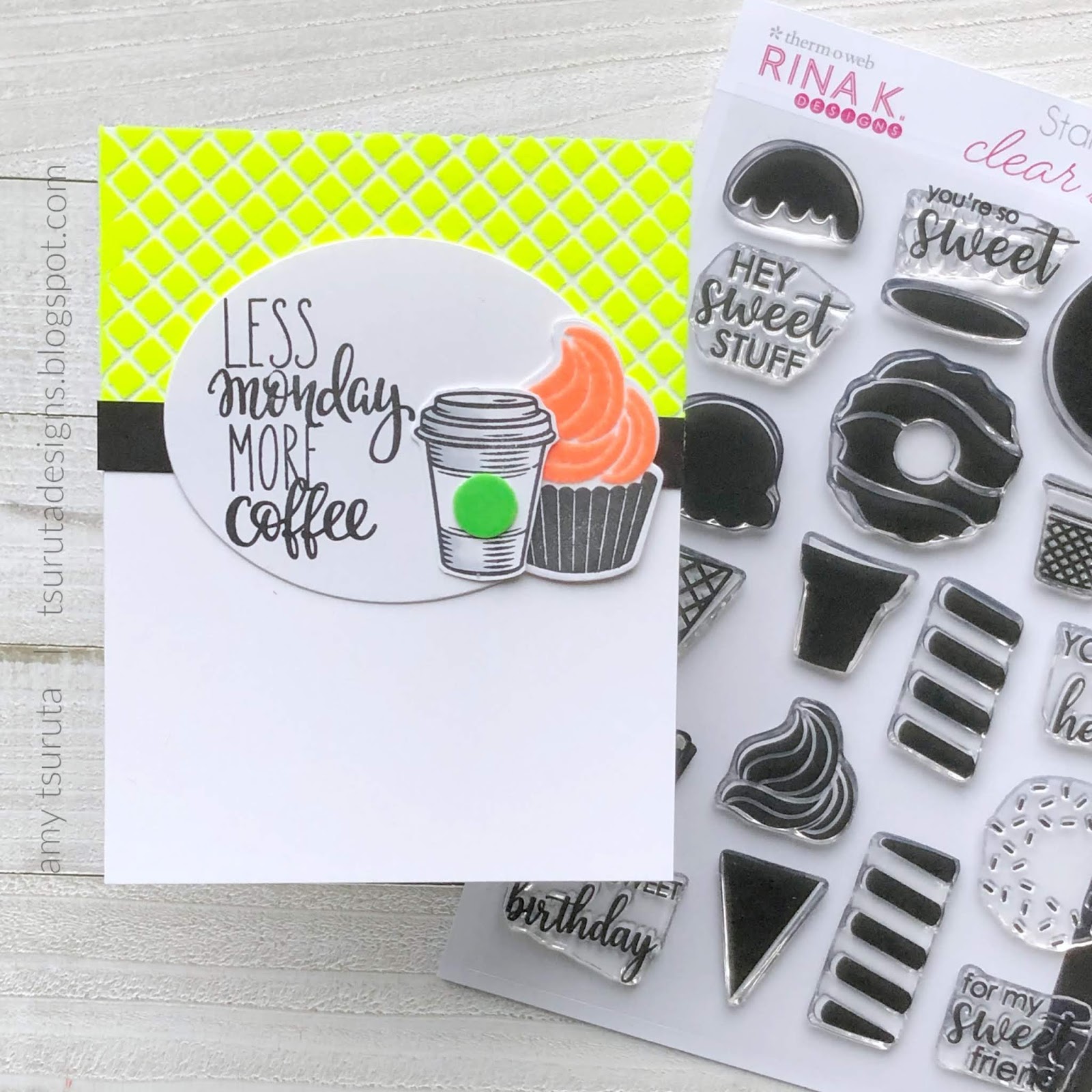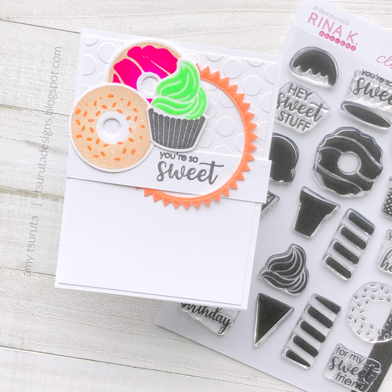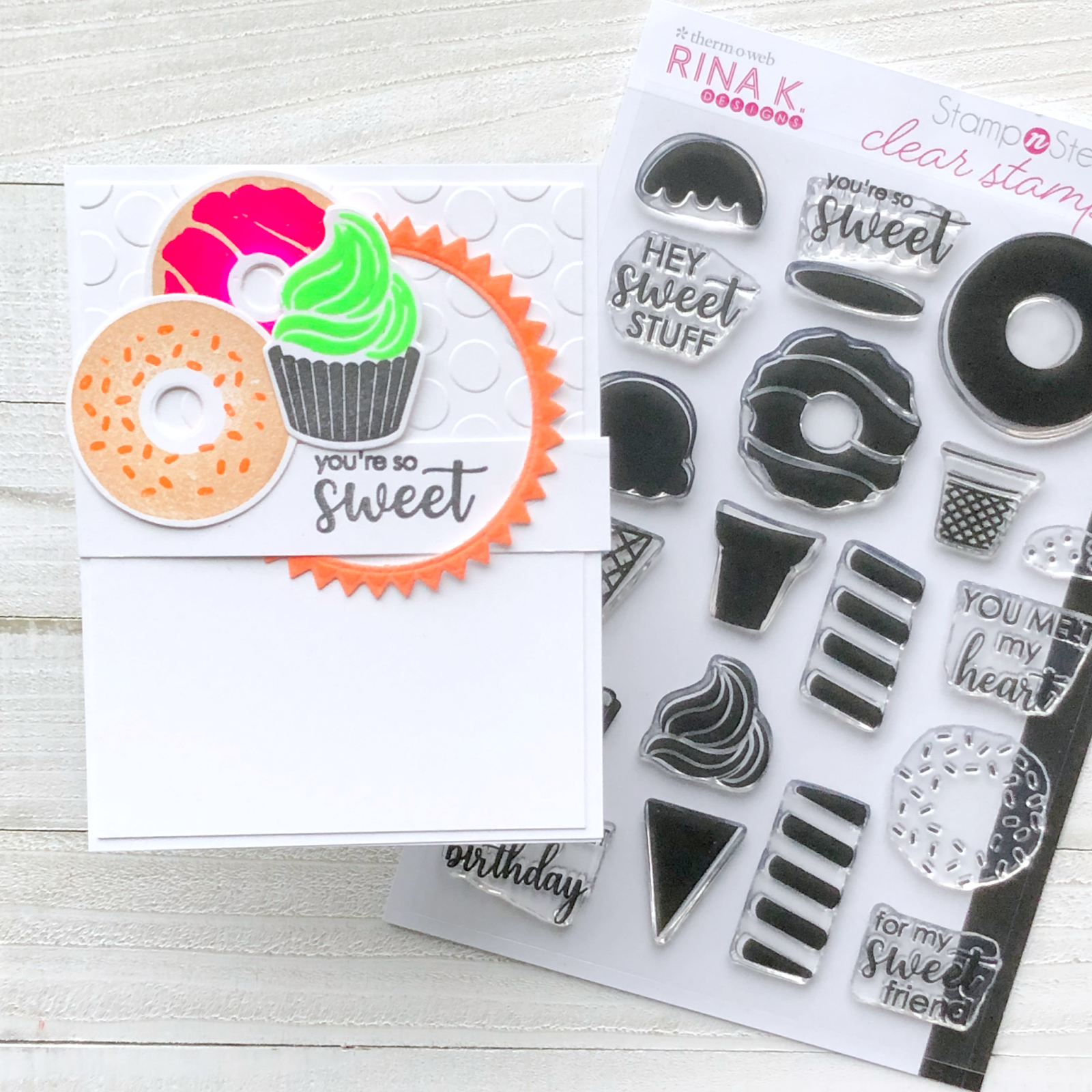 One of the things that I received was the Rina K Designs StampnStencil Stamp Set, Sweet Stuff with the coordinating die set. Let’s chat about my first card: