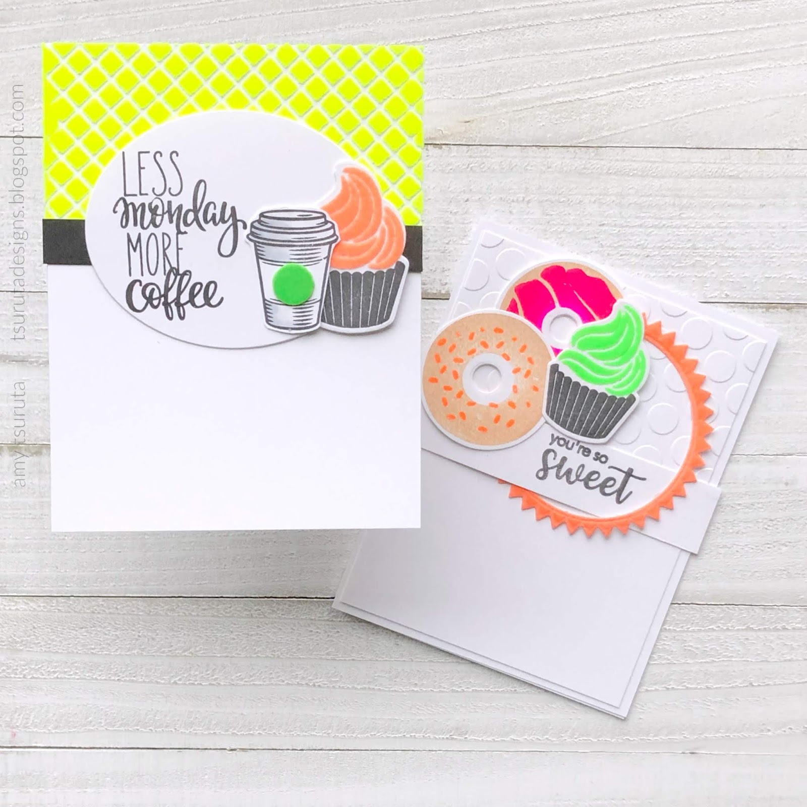 My next card combines the donuts and a cupcake. This design combines both the FLOCK, Screamin’ Green + Orange Glow with the Poppin’ Pink ENAMEL.