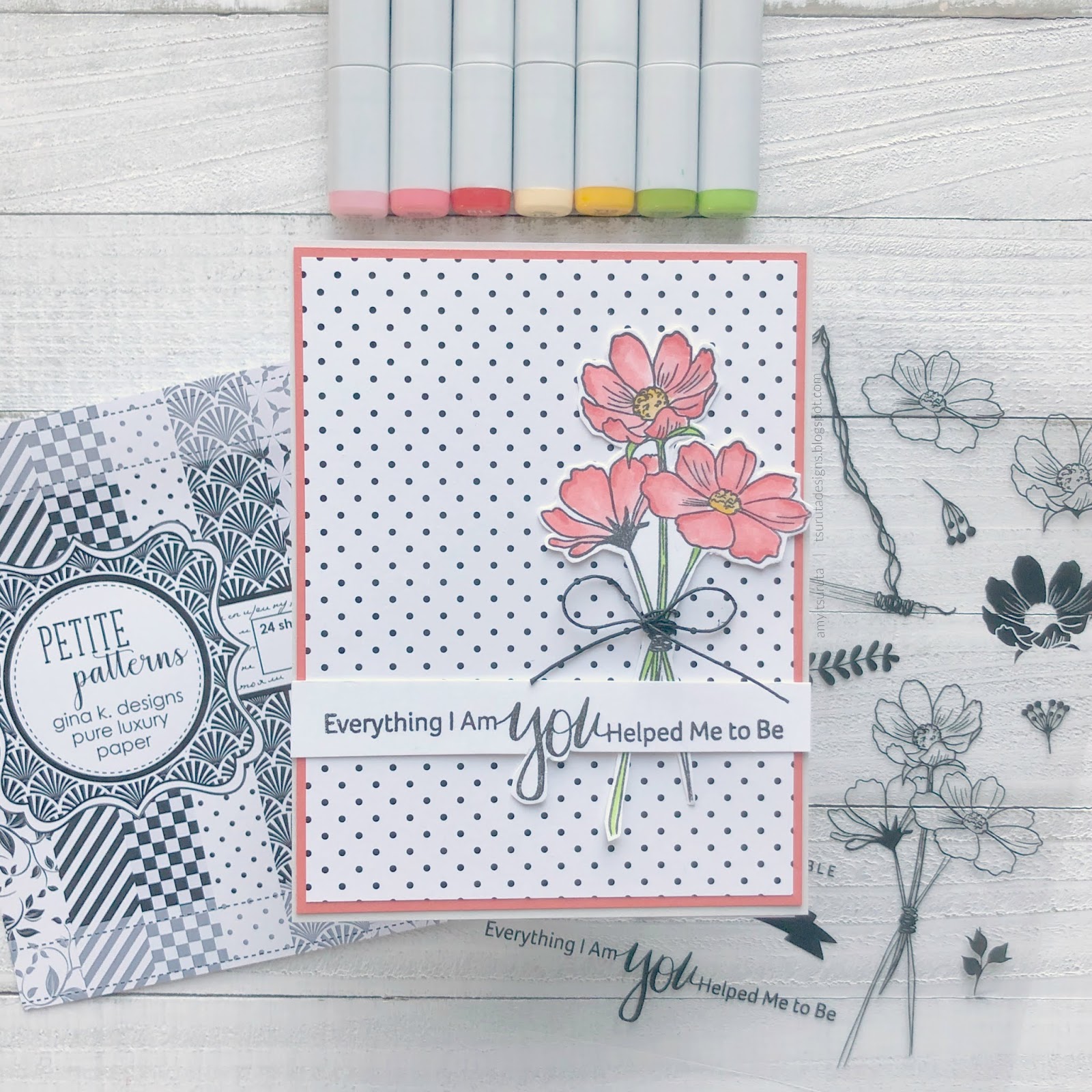 For my other card I used the bouquet image. I wrapped some waxed twine around the stems. Rather than use a black base I went with an oyster colored one and layered the colored cardstock and then topped it off with the same pattern panel from the Petite Patterns 6×6.