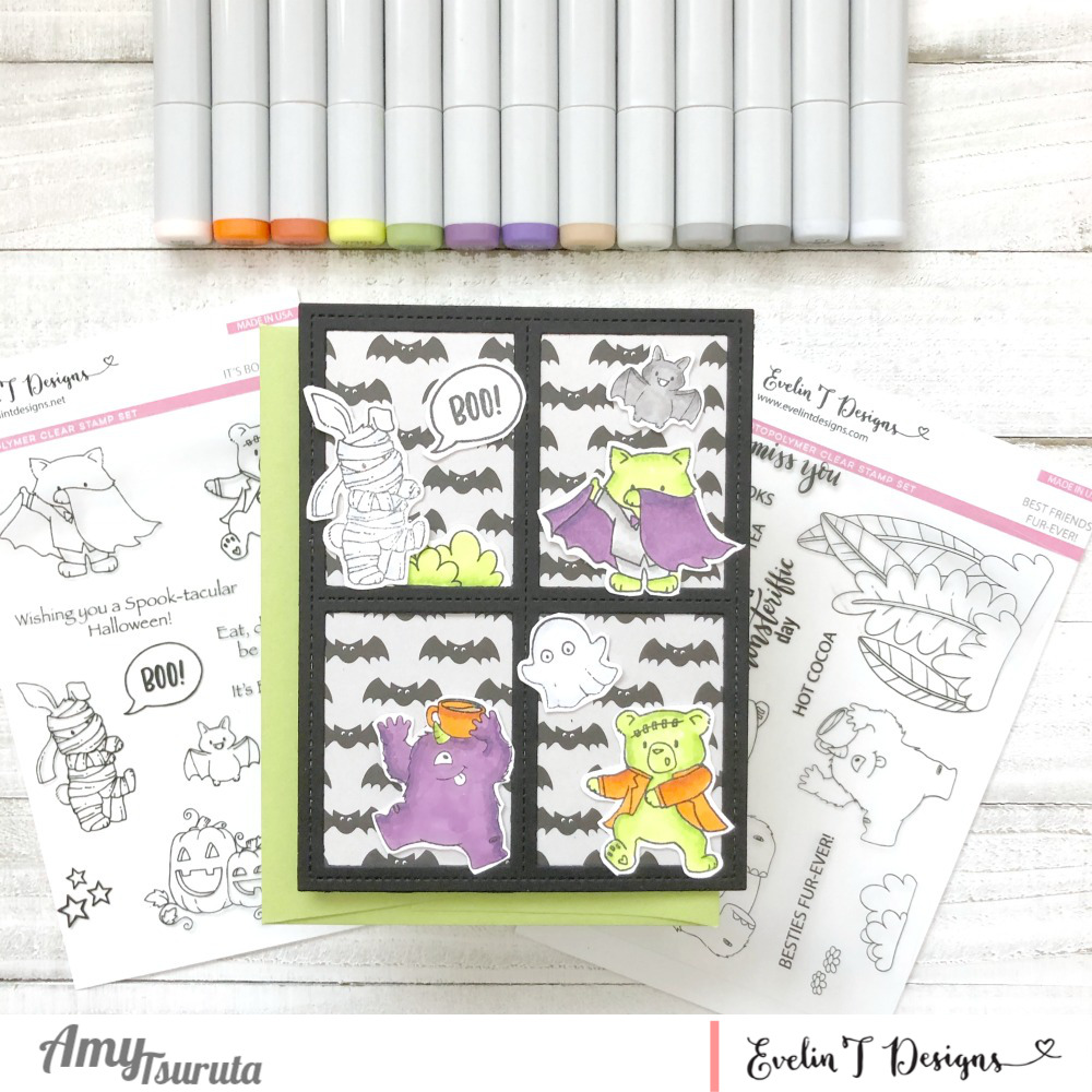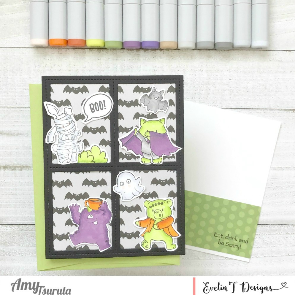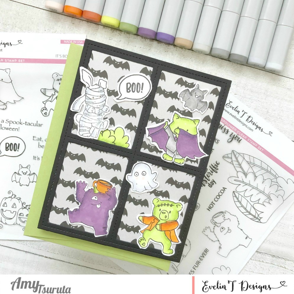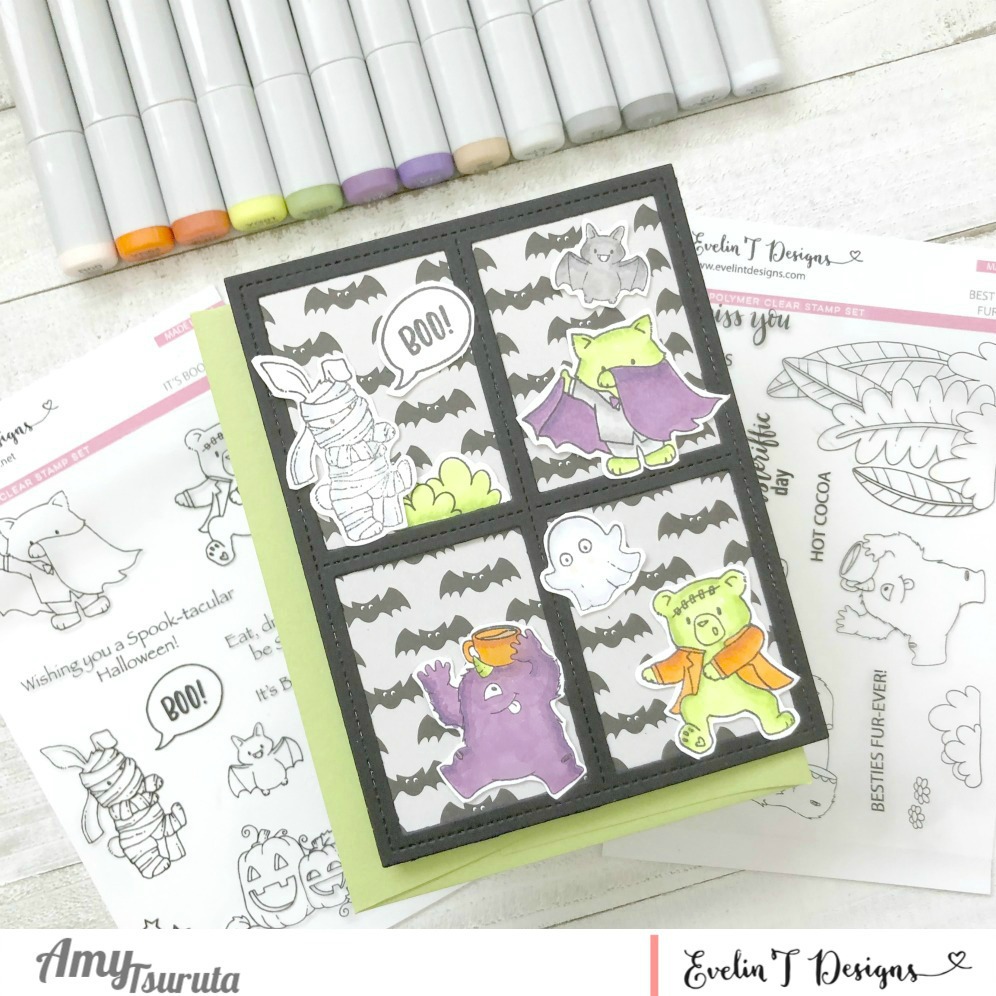 I’m still in my Fall Mode and wanted to share this Halloween card made with Evelin T Designs‘ stamps: