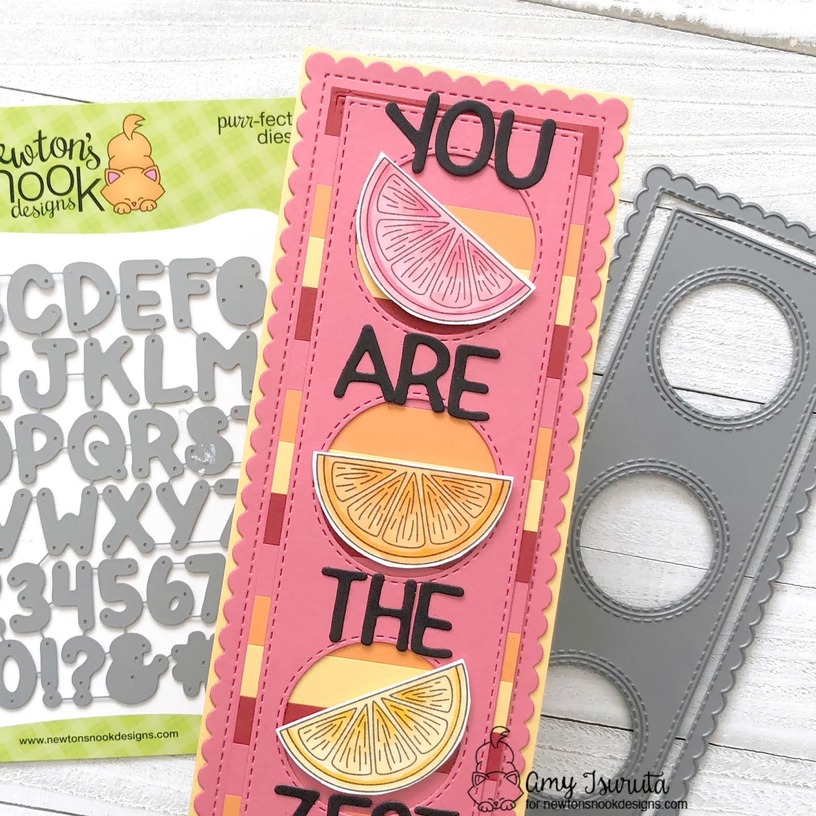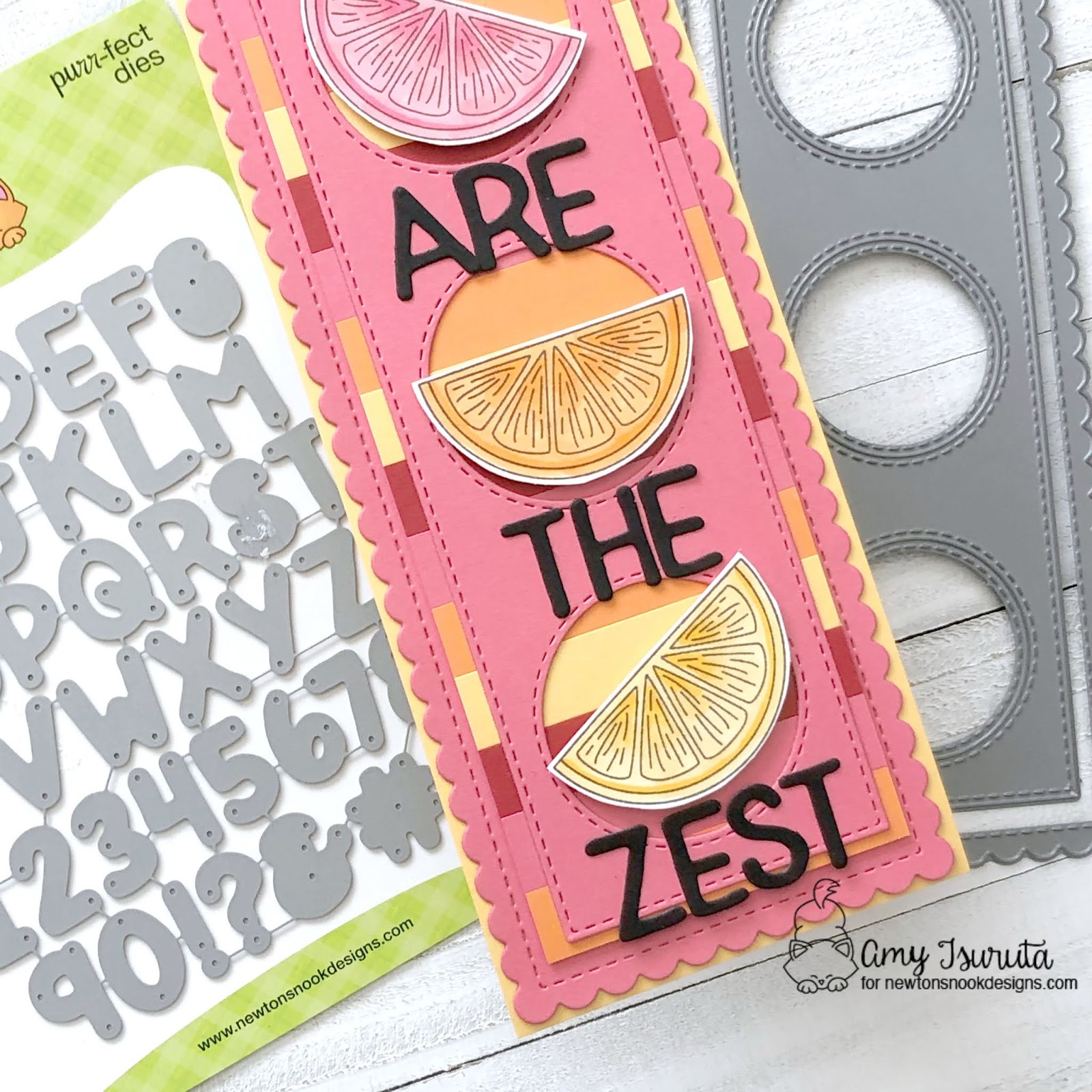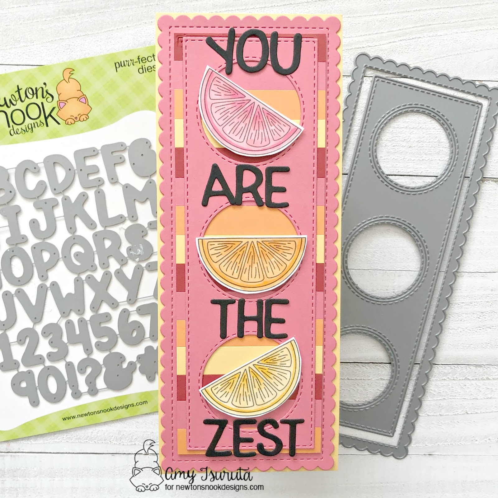 I cut strips of colored cardstock to customize my citrus card palette! The new Slimline Frames are fantastic and so very versatile. I think the added panel in between the portholes and the scallop panel along with a solid base underneath the scallop frame make for fun layering.