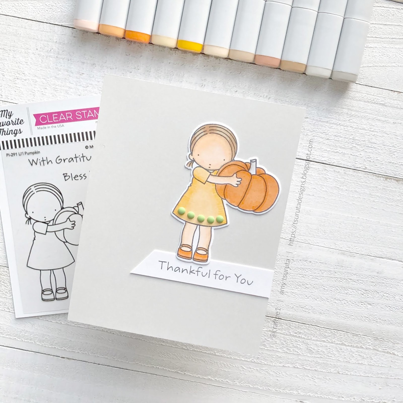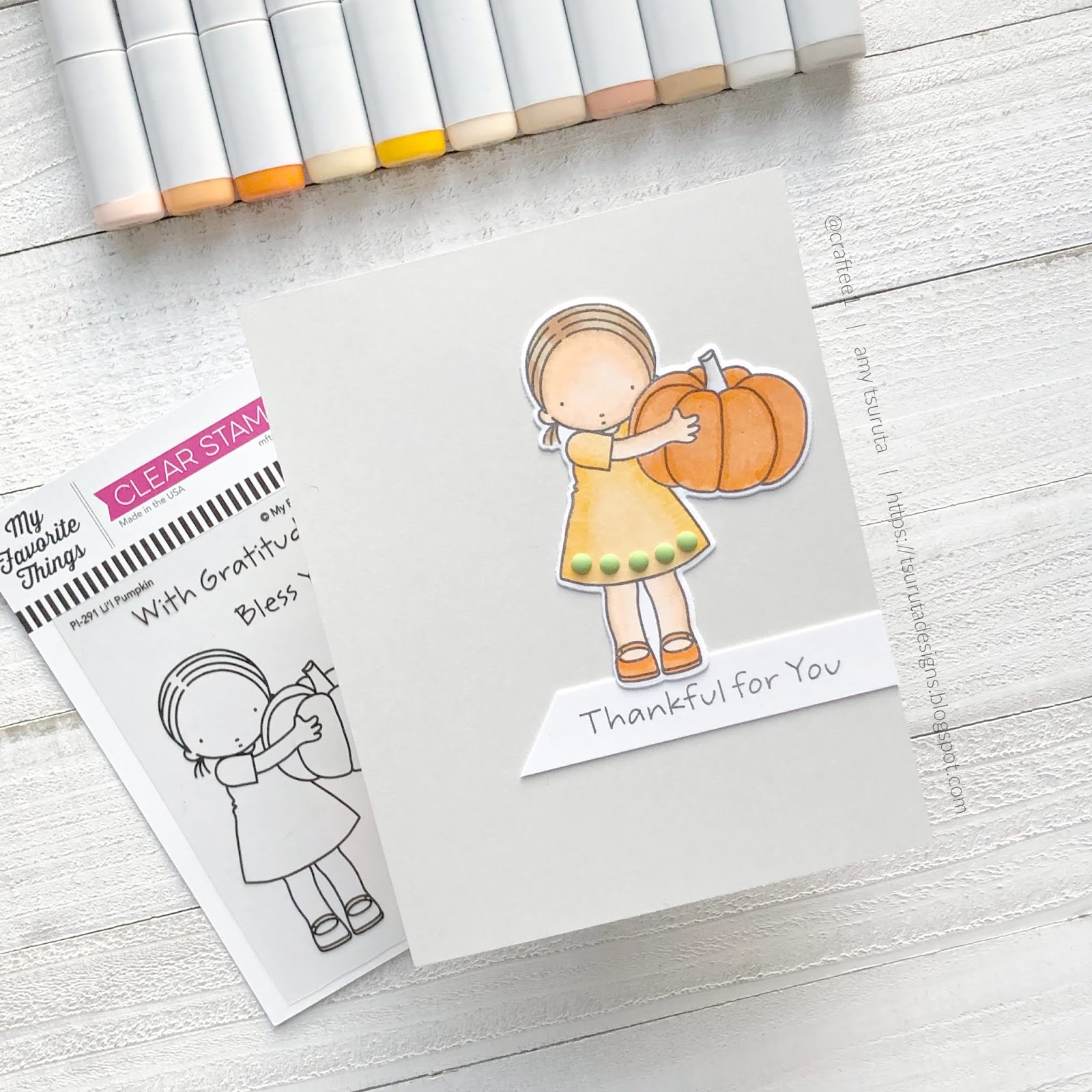 Originally I thought I was going to design a summery card and then I spotted this MFT Li’l Pumpkin set. I picked it up when they had a sale on their site and now it looks like it is retired. I don’t gravitate to ‘people’ images but love all things pumpkin. I’m happy to ink this up!