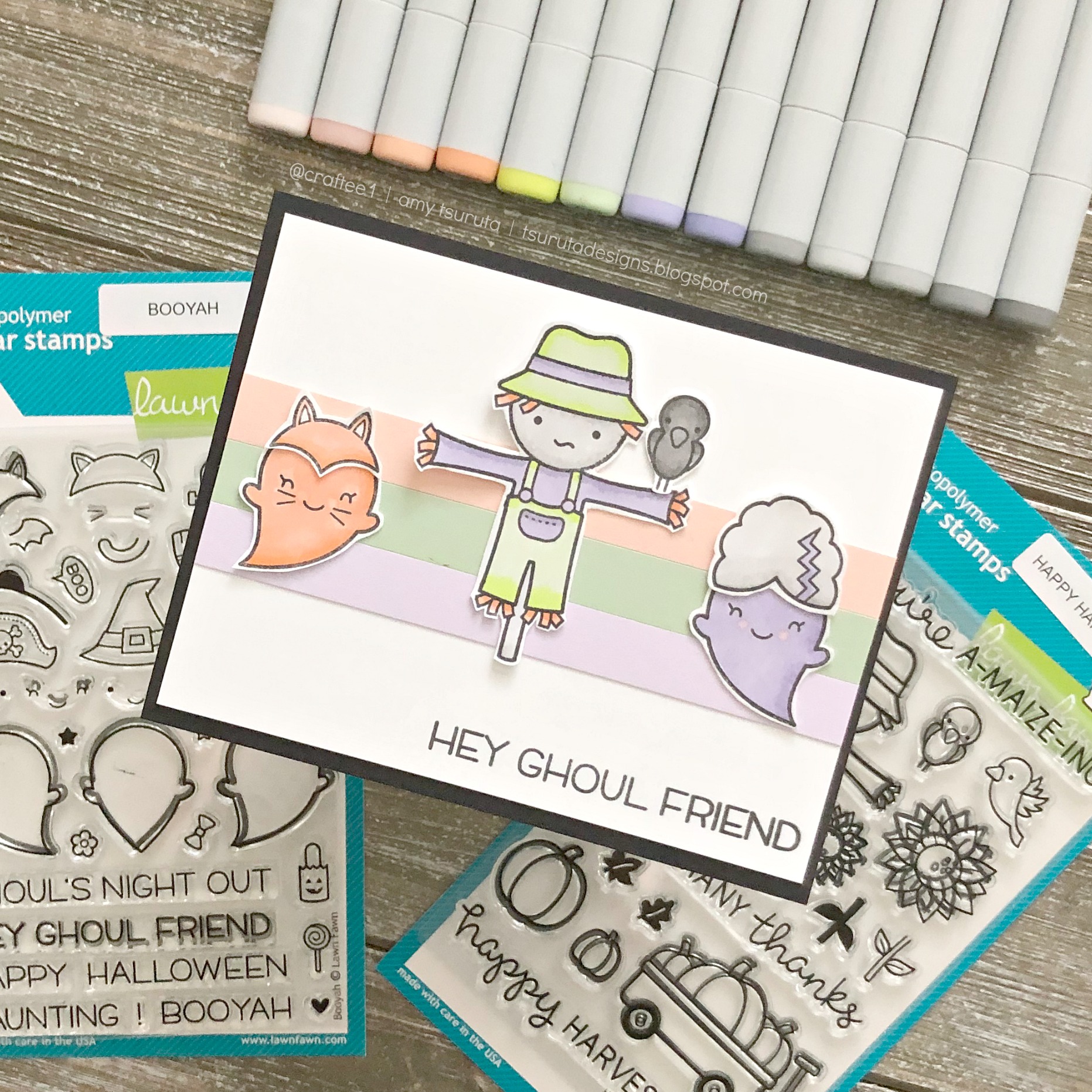 I combined Lawn Fawn’s Happy Harvest + Booyah. For you Lawn Fawn fans, you might notice that I masked off the original scarecrow’s face and added a face from the Booyah set. That particular expression cracks me up. It might make you think that the ghost was having second thoughts about their costume choice OR that the scarecrow is a bit leery of those ghosts.