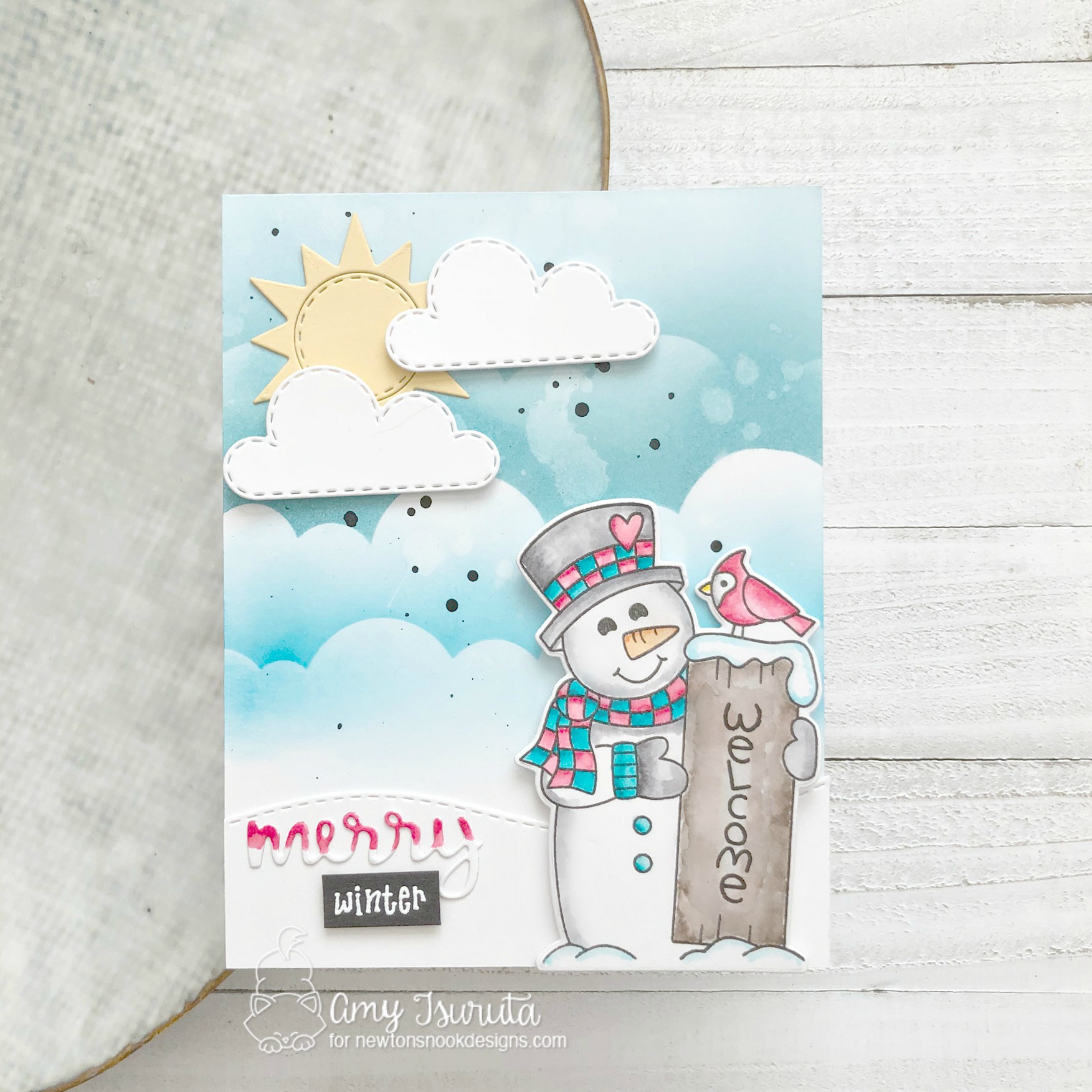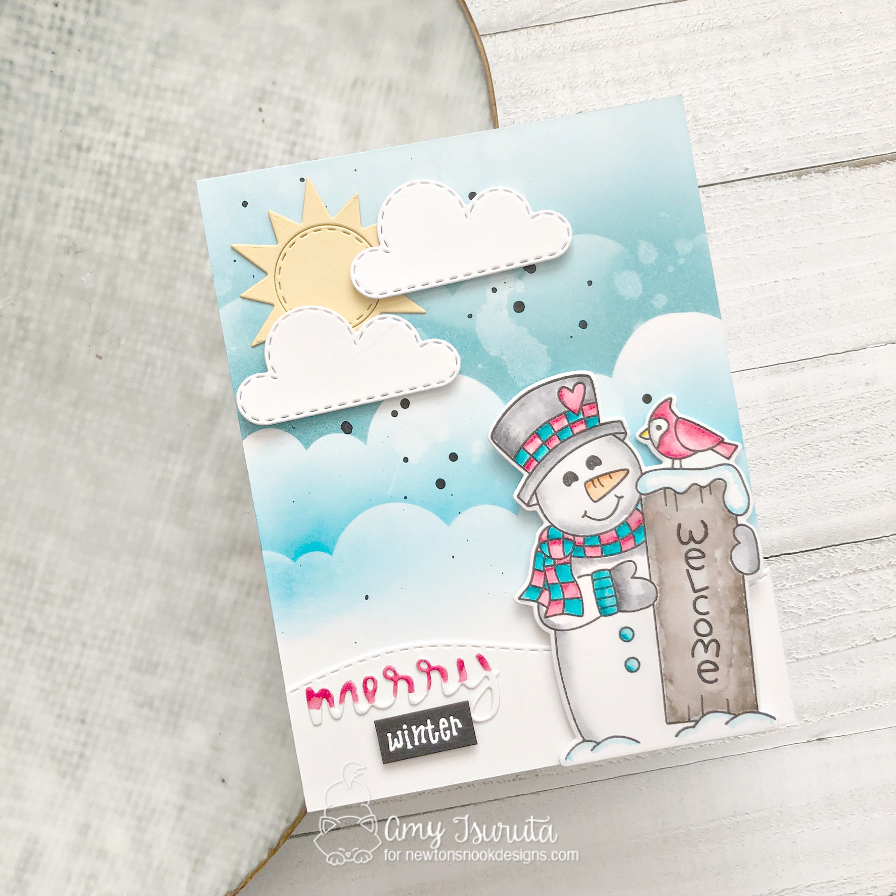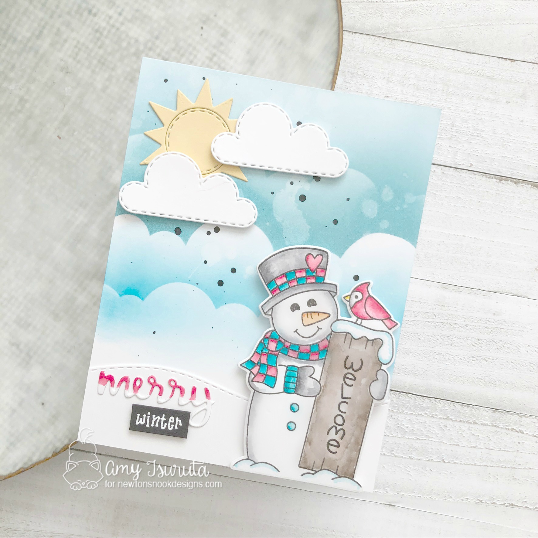 Amy – I love the softness of the colors you have chosen for this card – this snowman is so stinkin cute and adorable as well – I love the sun and clouds in your layout and how you did the word merry with the soft red and white – tfs and for this wonderful hop – I am a snowman FREAK – love him!