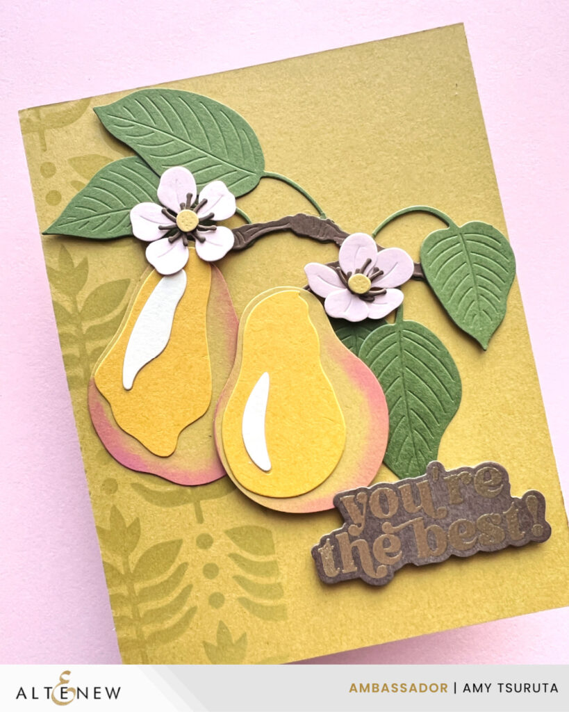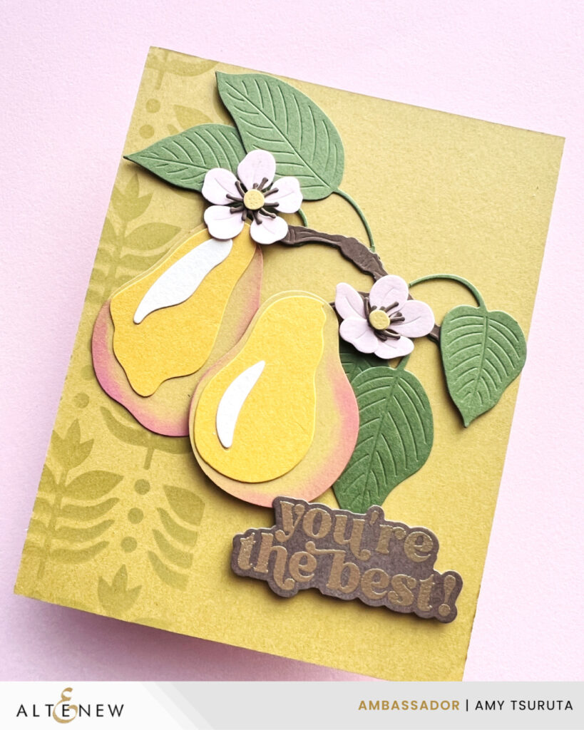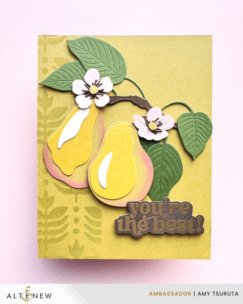 I built the pears using the Altenew instructions. I love the Key-Hole System. Stack the layers using the same shape guides. I finished off the pears with a bit of red ink blending. Think Red Anjou Pears. The sentiment was not cooperating with the photography.
