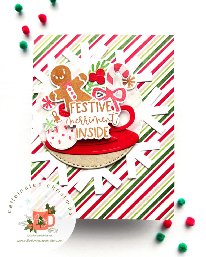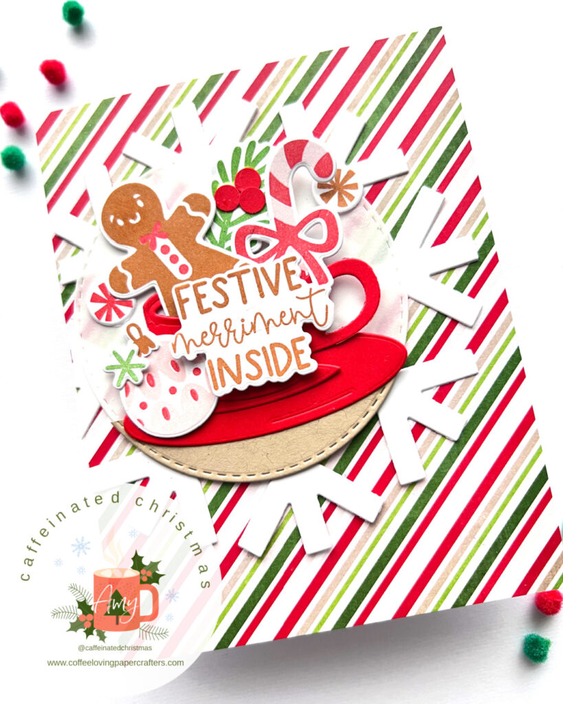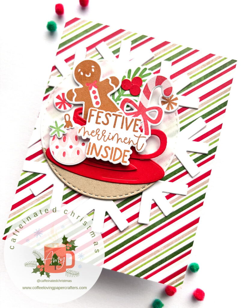 I used a panel of paper from Miss Kate’s ‘Tis the Season 6×6. I went a bit crazy with all the stamping so that the Birthday Coffee Mug is a bit buried, but it’s there!