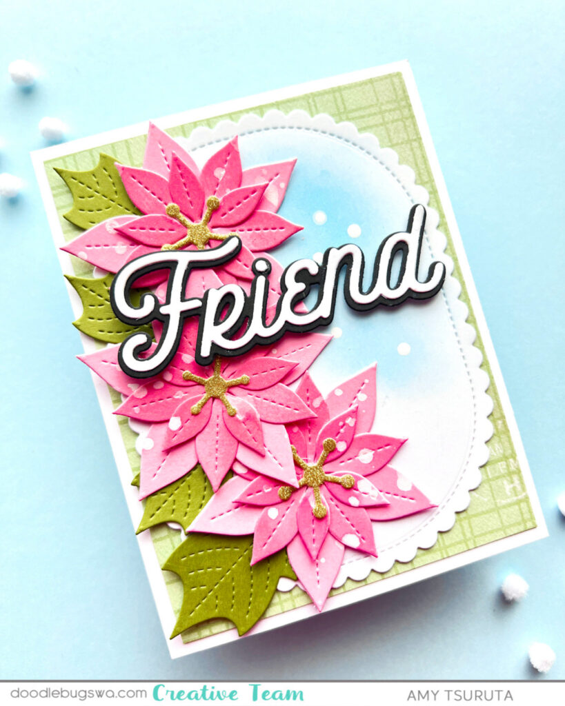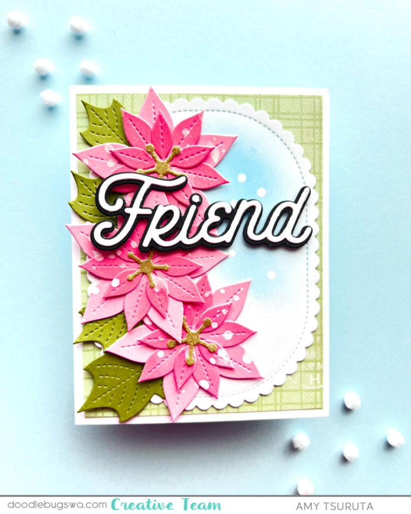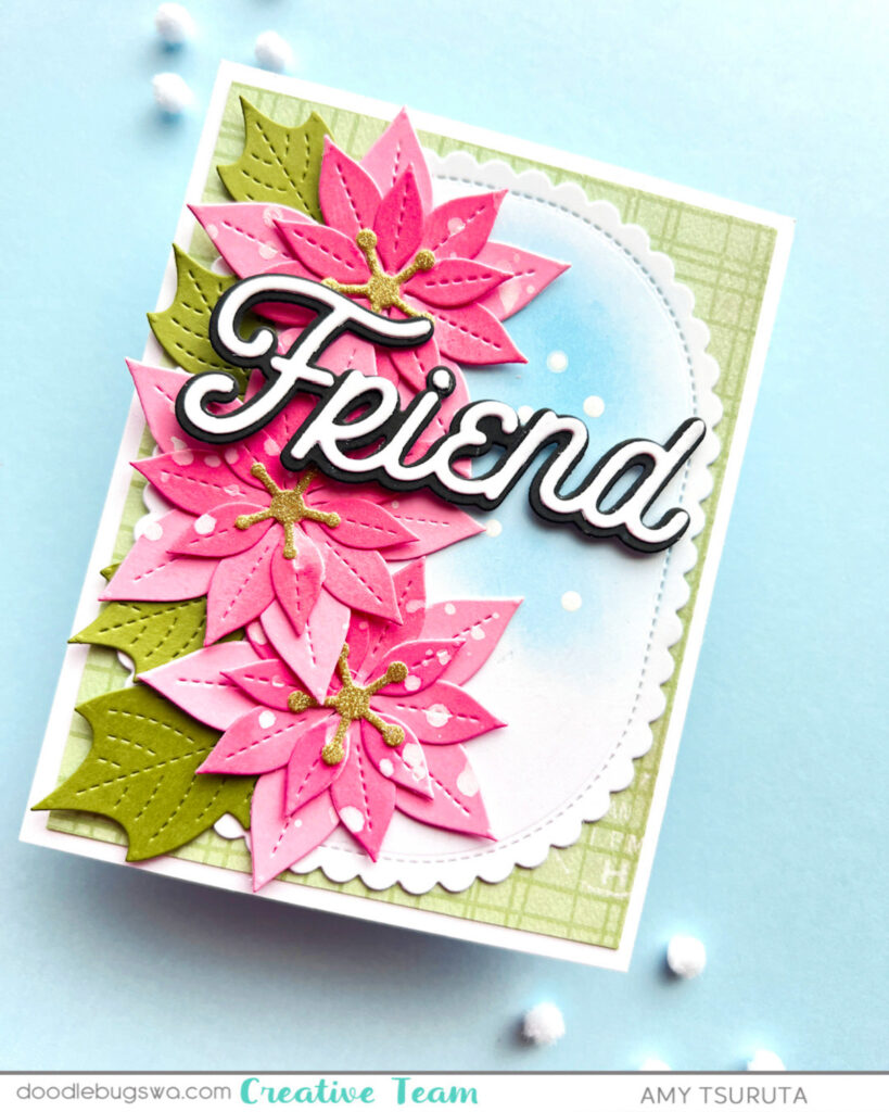 When I was deciding what I wanted to featured, I started off with the Mama Elephant – Placemat set. I haven’t used the Lawn Fawn Poinsettia set much so I went with that. I used some diluted acrylic paint for the splatters on the blooms.