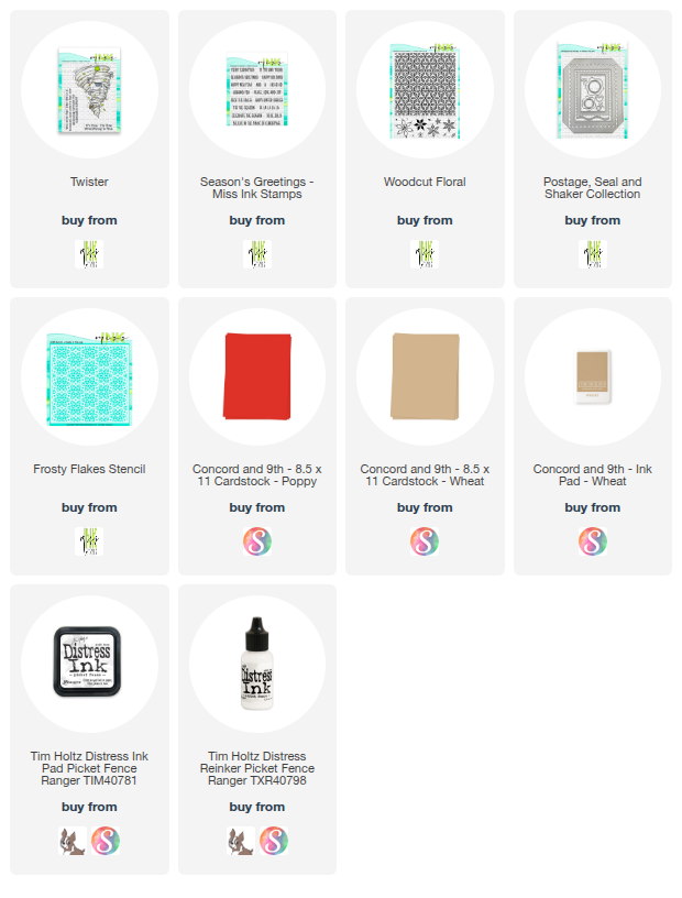 The Frosty Flakes stencil work was done in Distress Ink – Picket Fence. The Woodcut Floral was stamped in Wheat on Wheat cardstock.