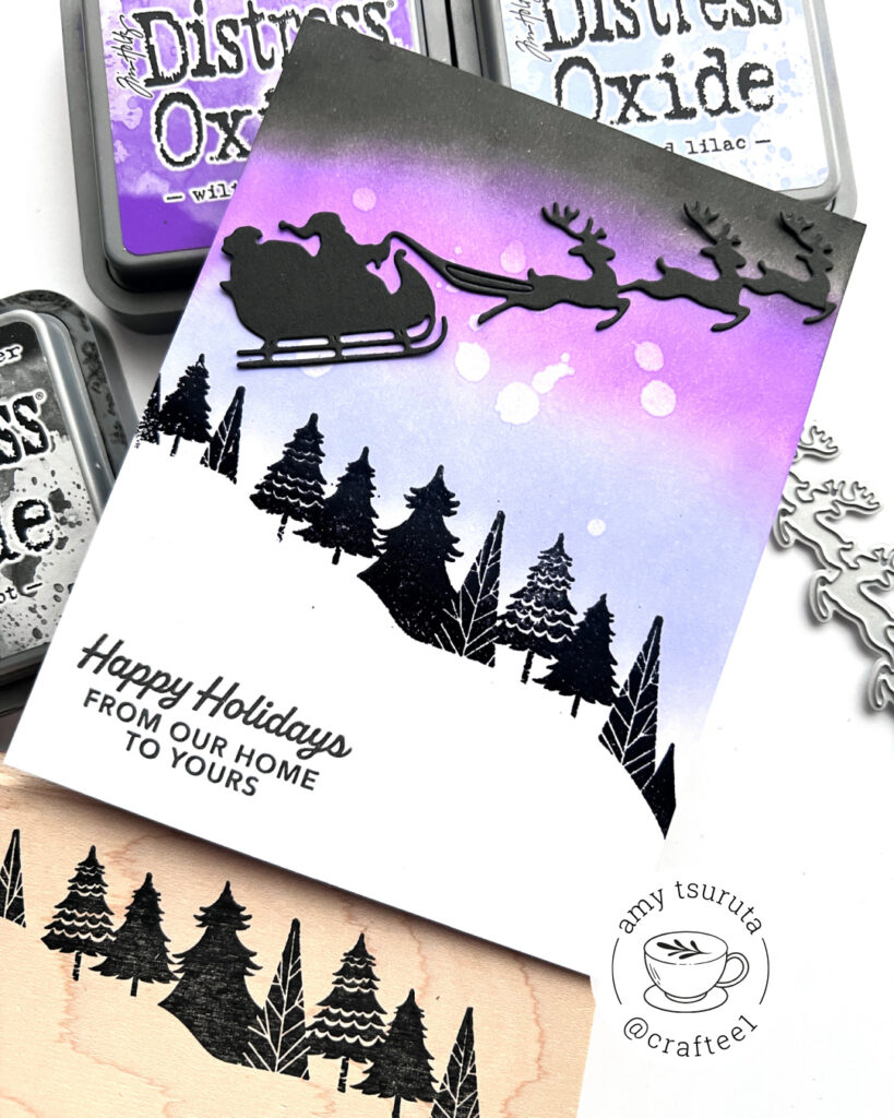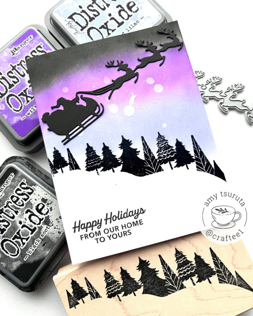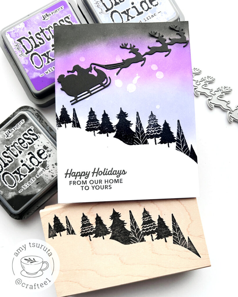 The trees were stamped with an embossing pad and heat embossed in black. I tend to always use watercolor paper for my ink blending BUT I find that heat embossing with solid images doesn’t do the best so I just used white cardstock for this card.