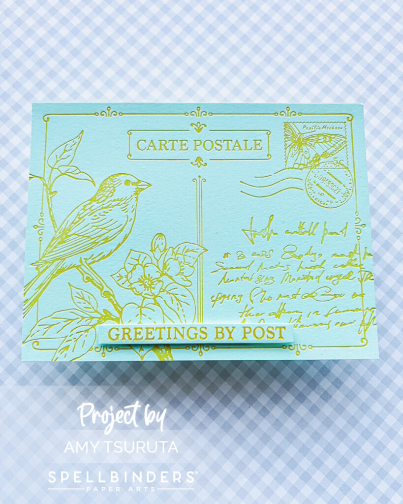 The sentiment is from the Typewriter Adventure Sentiments stamp set. It has been heat embossed in gold. In order to accommodate the butterflies, I went up to a 5×7 card base [which seems huge to me].